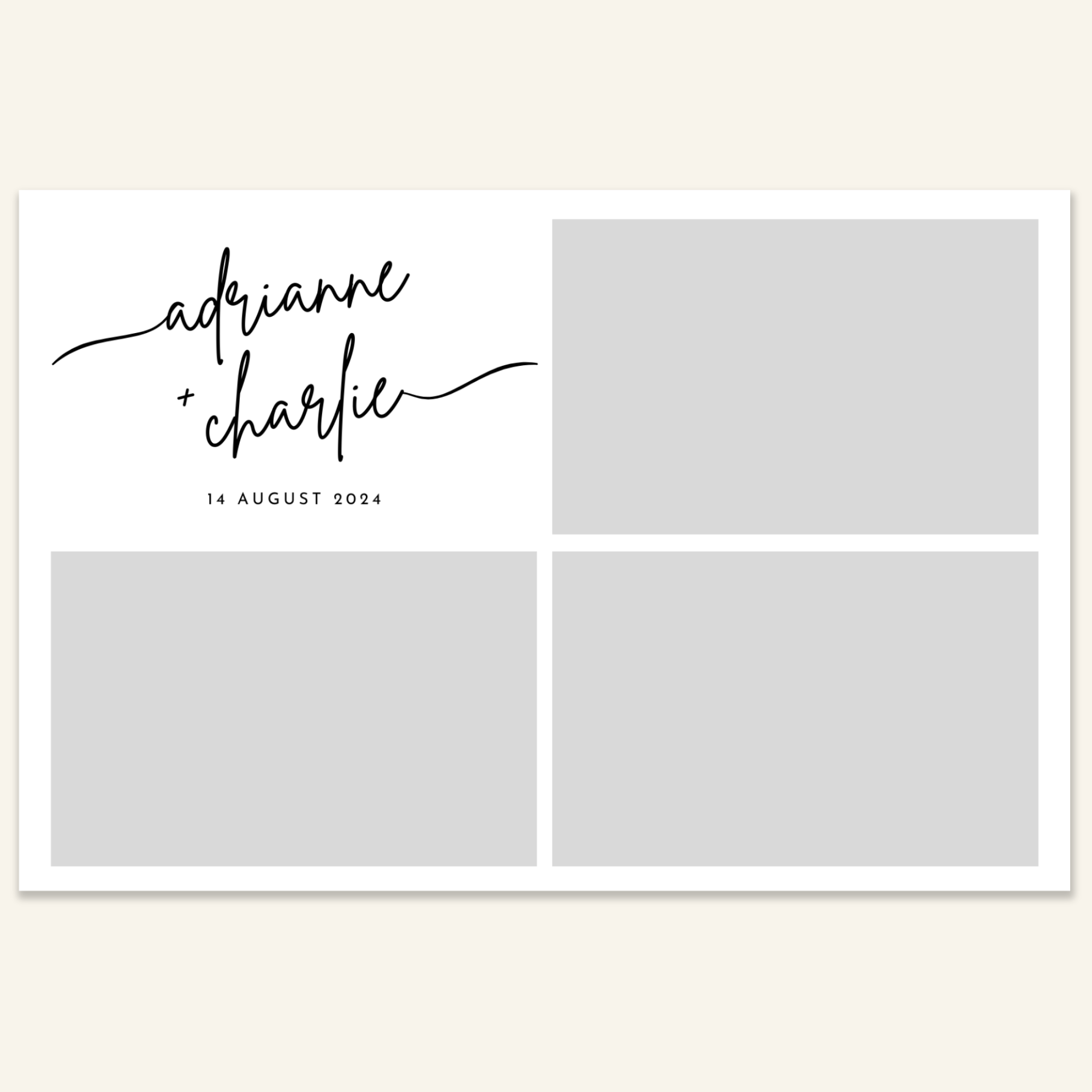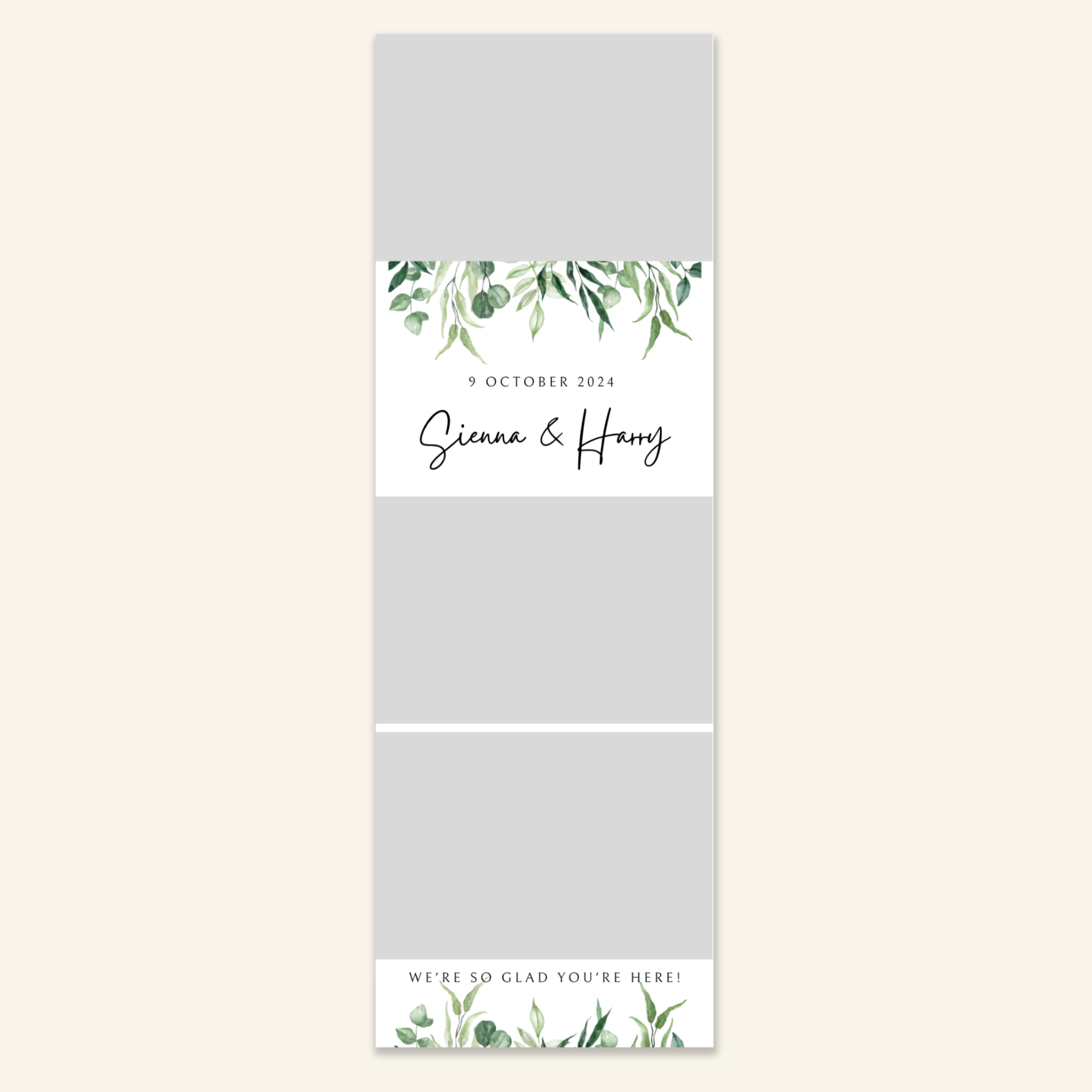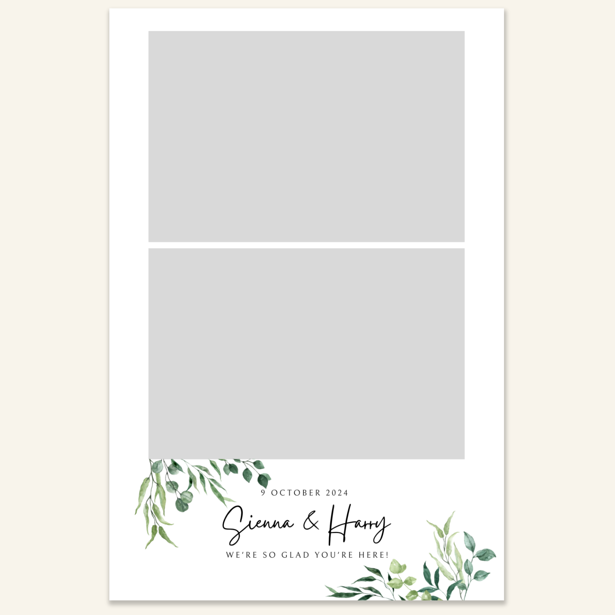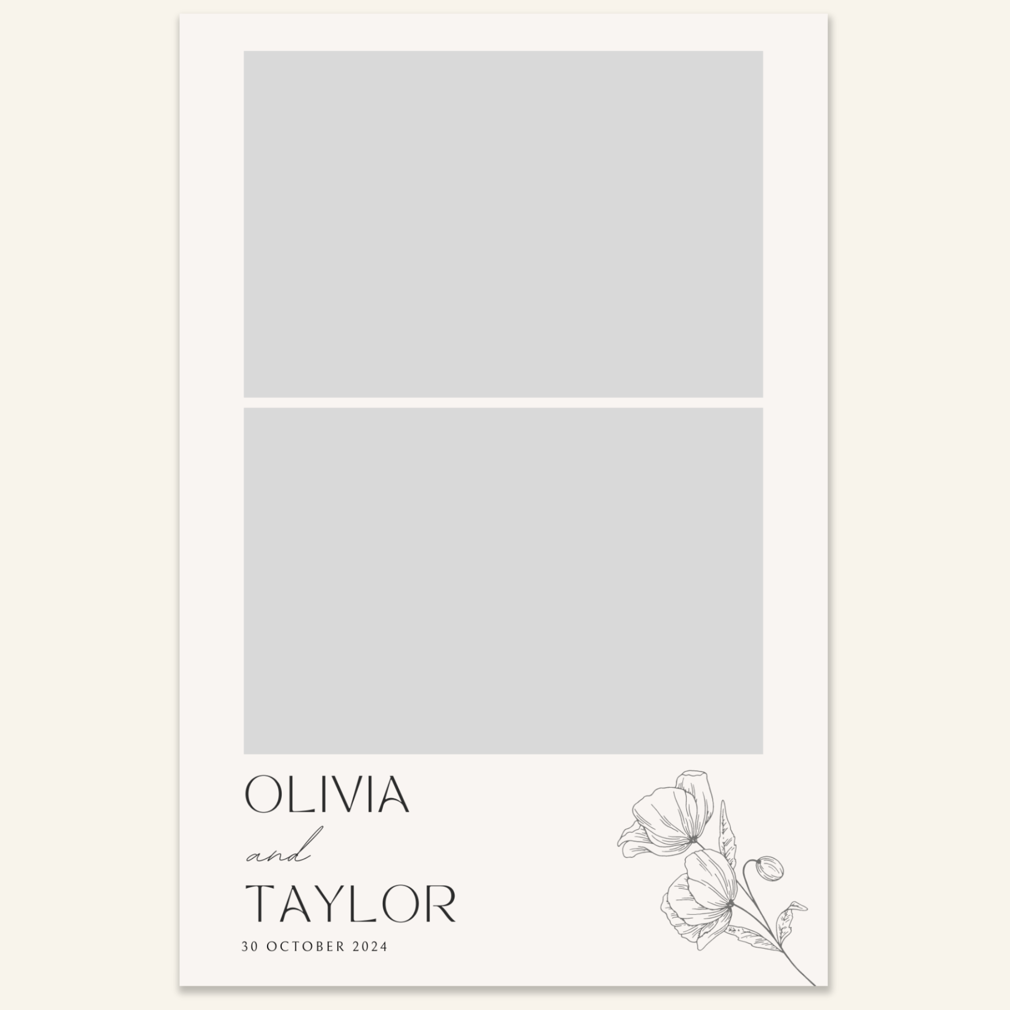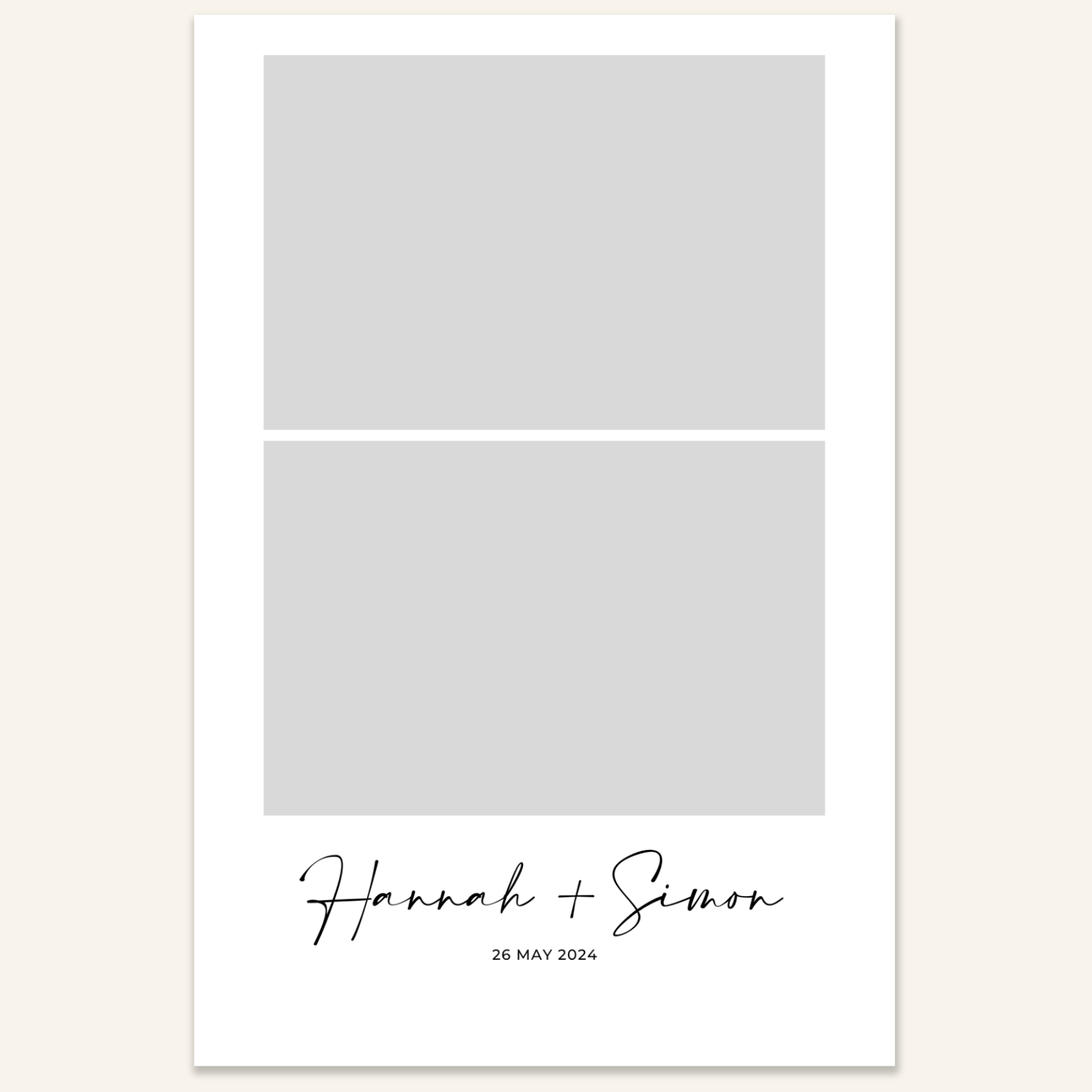 Step 3: Personalise your print template by adding your event name, date, and/or custom message. (eg. Sophia & Lucas / 12 April 2024 / Thanks for joining us!)