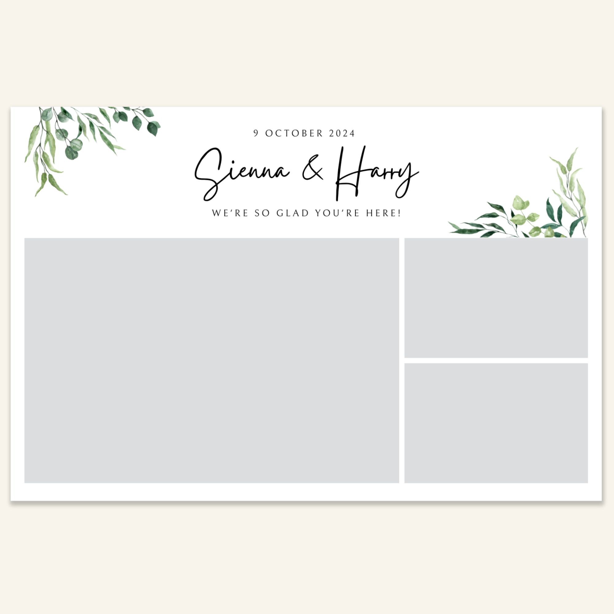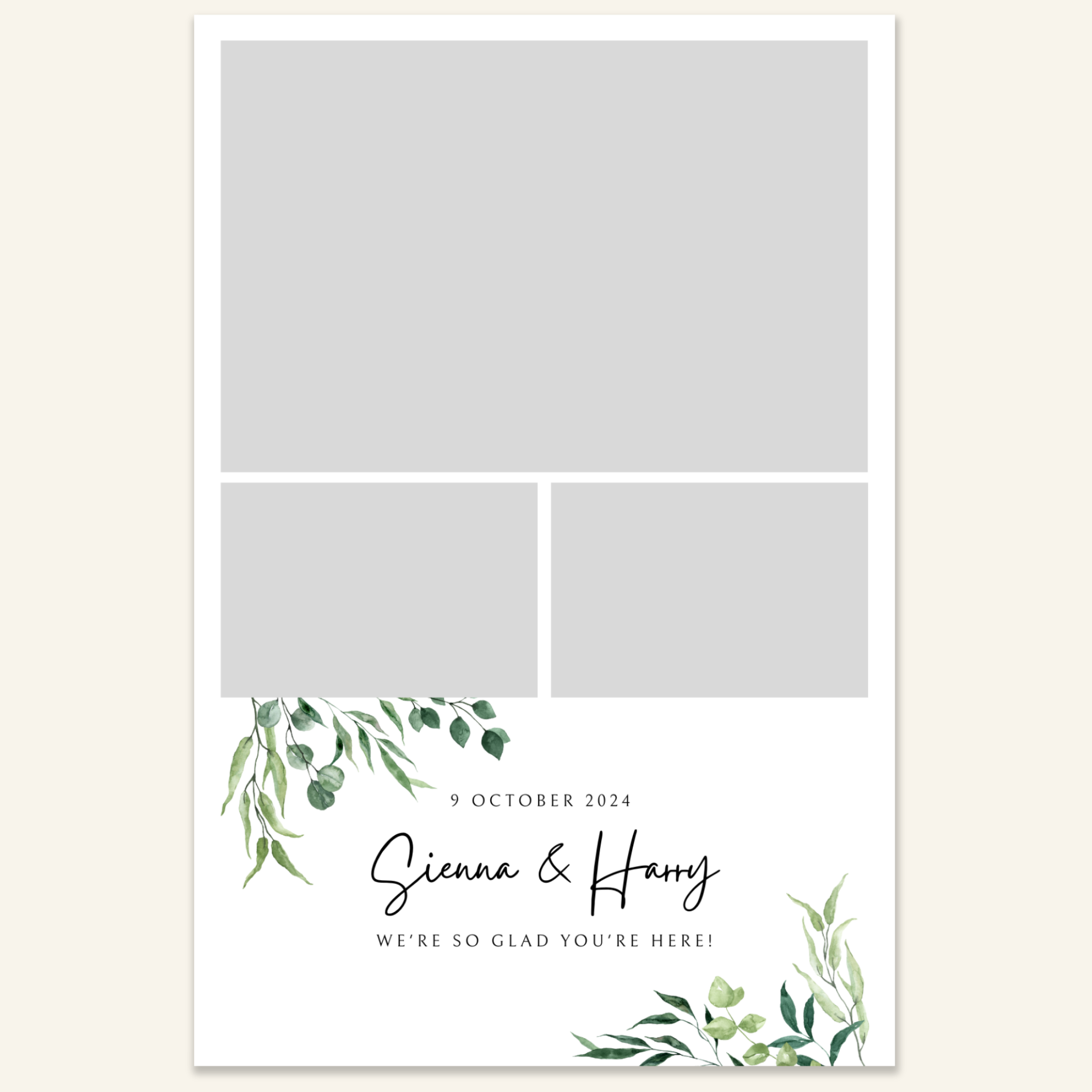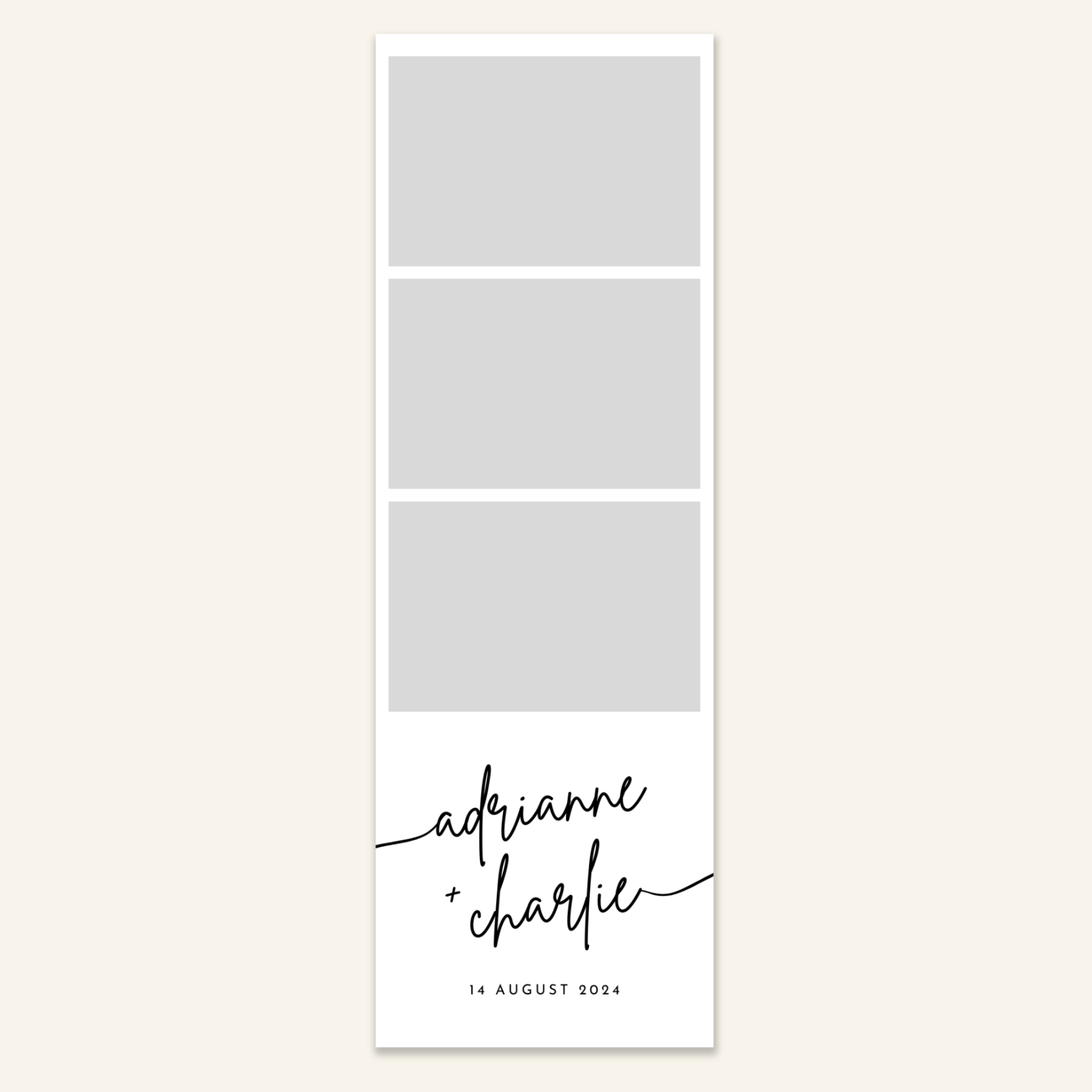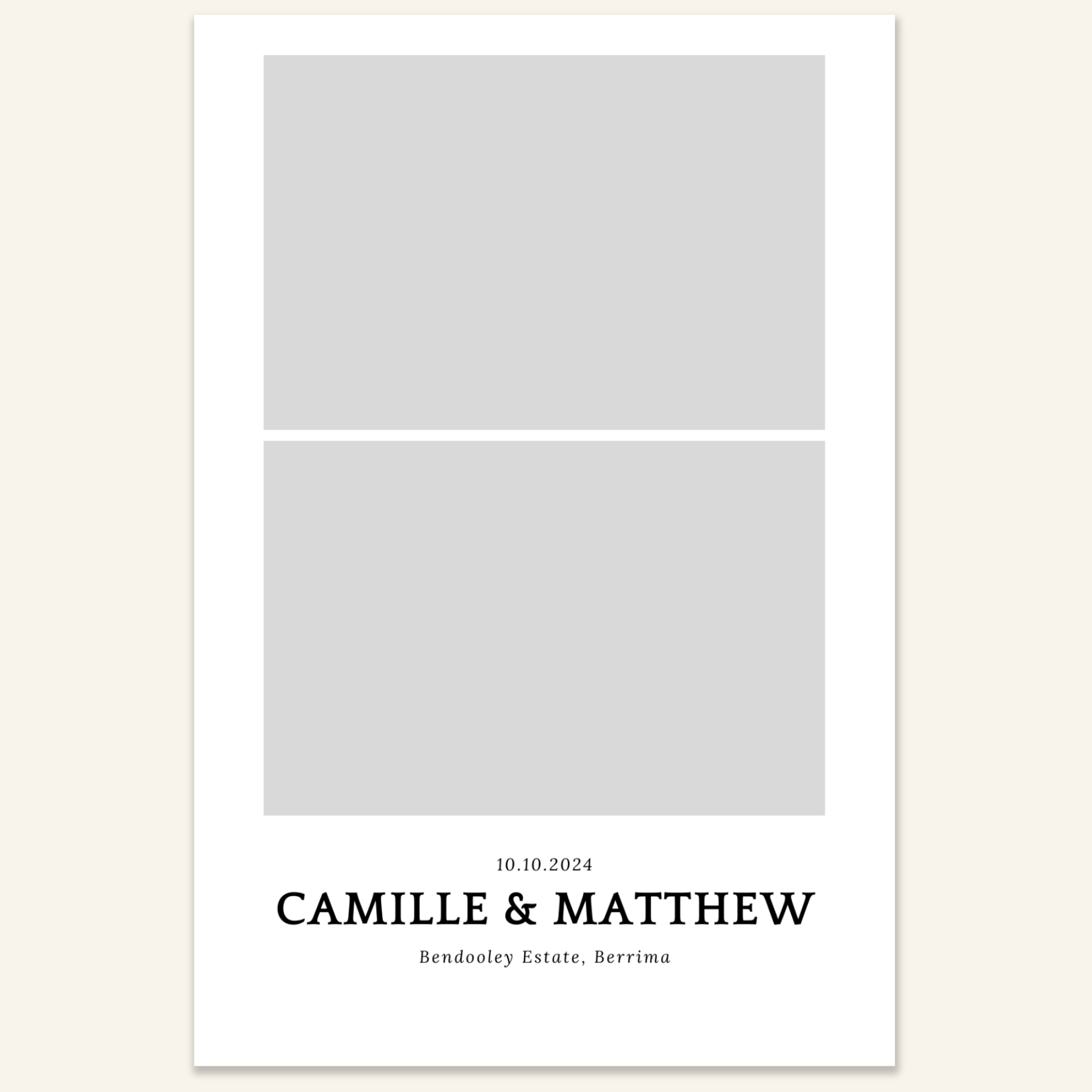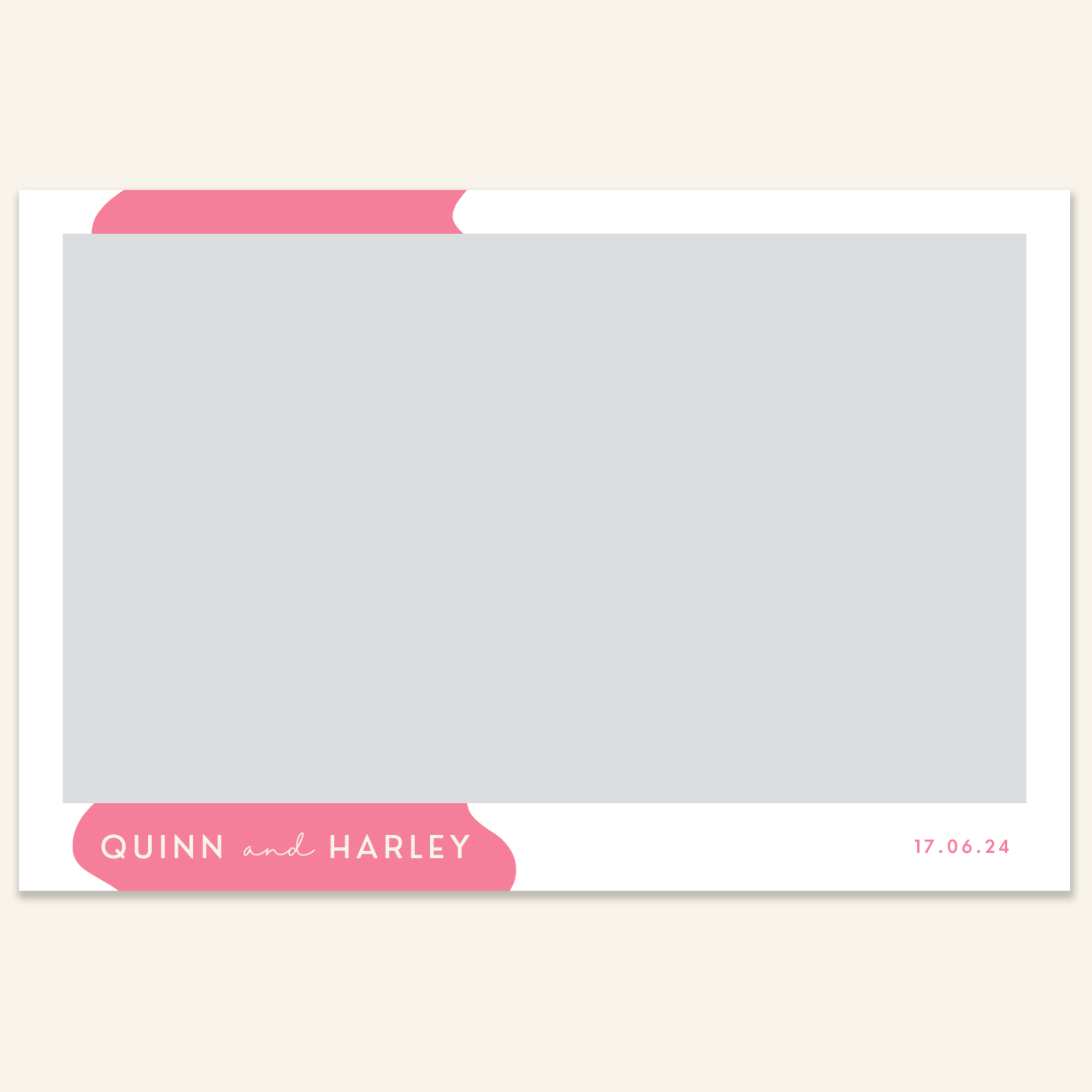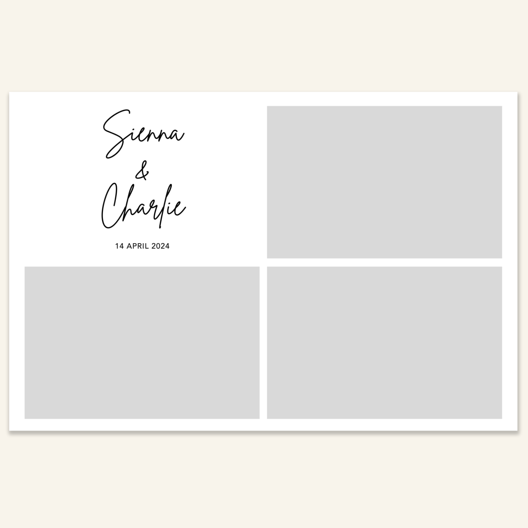 Step 3: Personalise your print template by adding your event name, date, and/or custom message. (eg. Sophia & Lucas / 12 April 2024 / Thanks for joining us!)