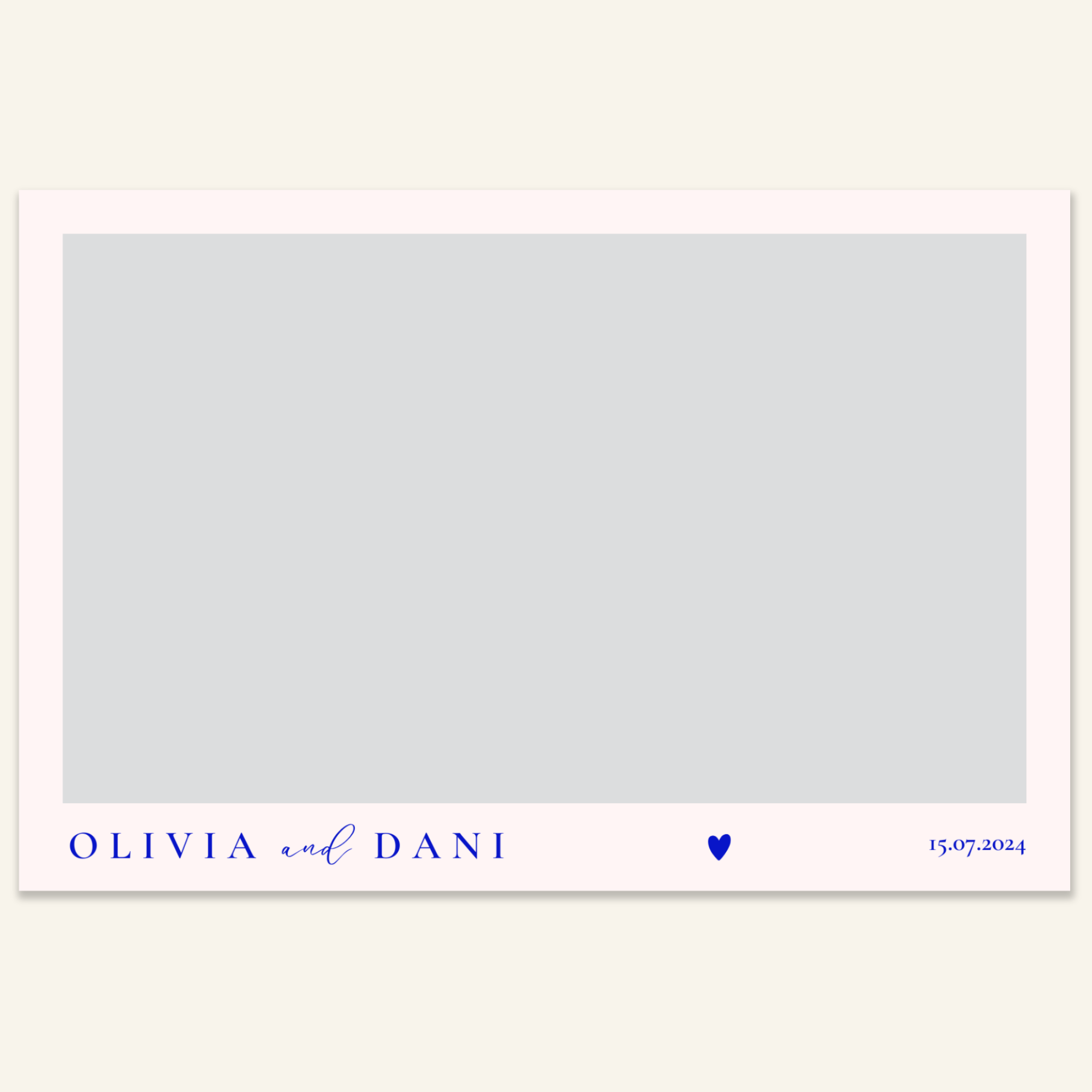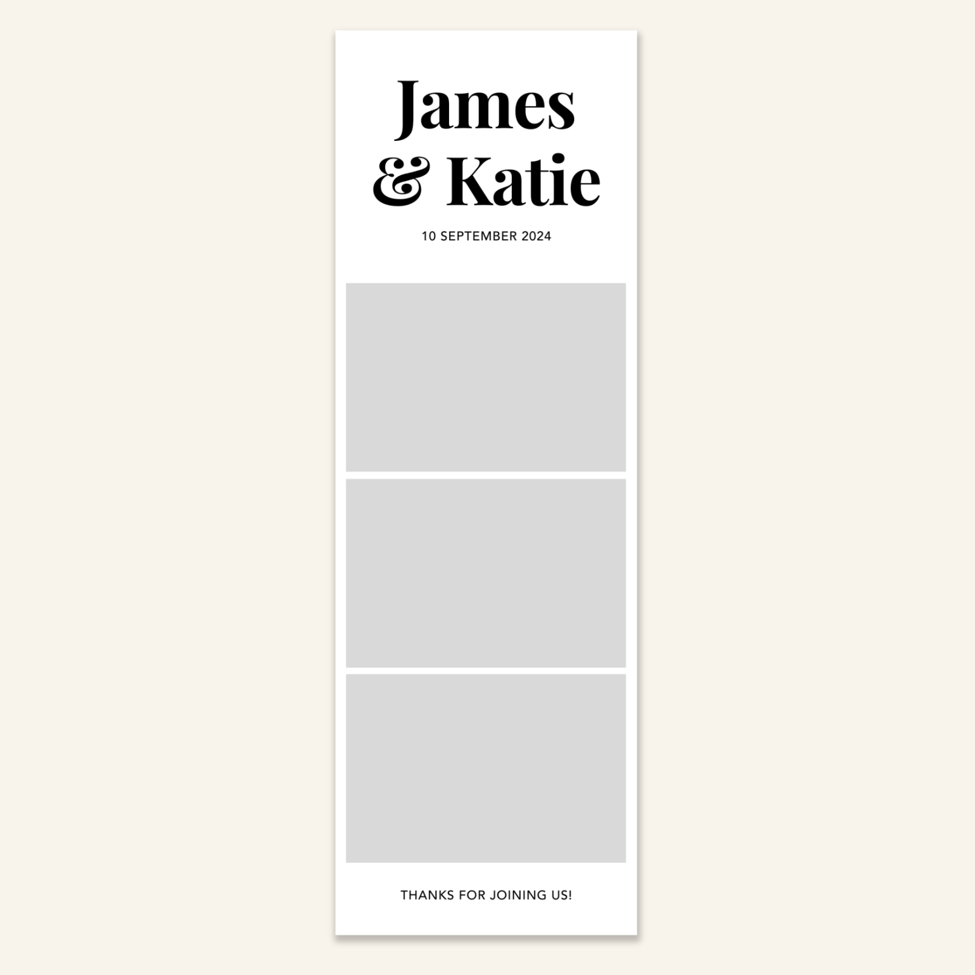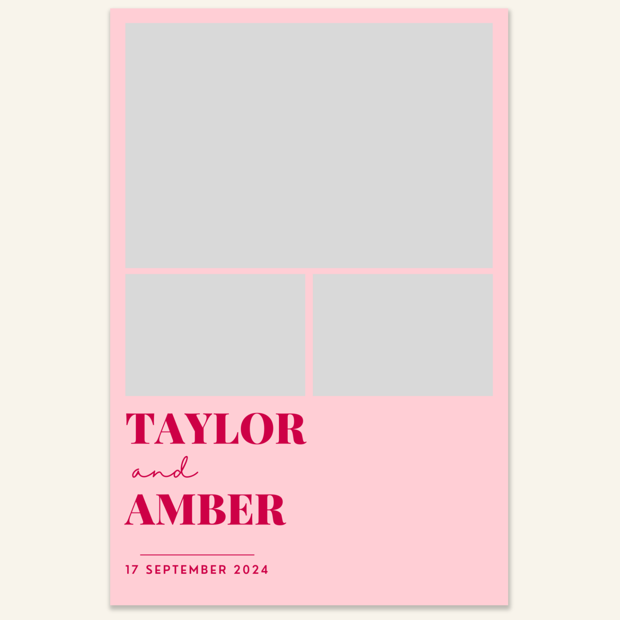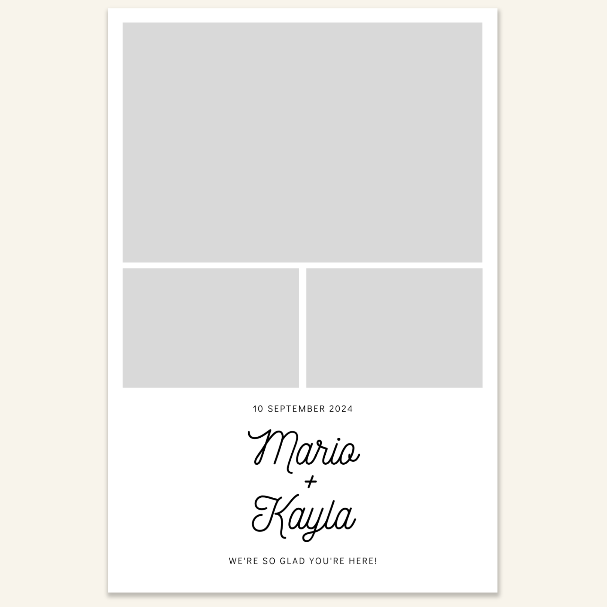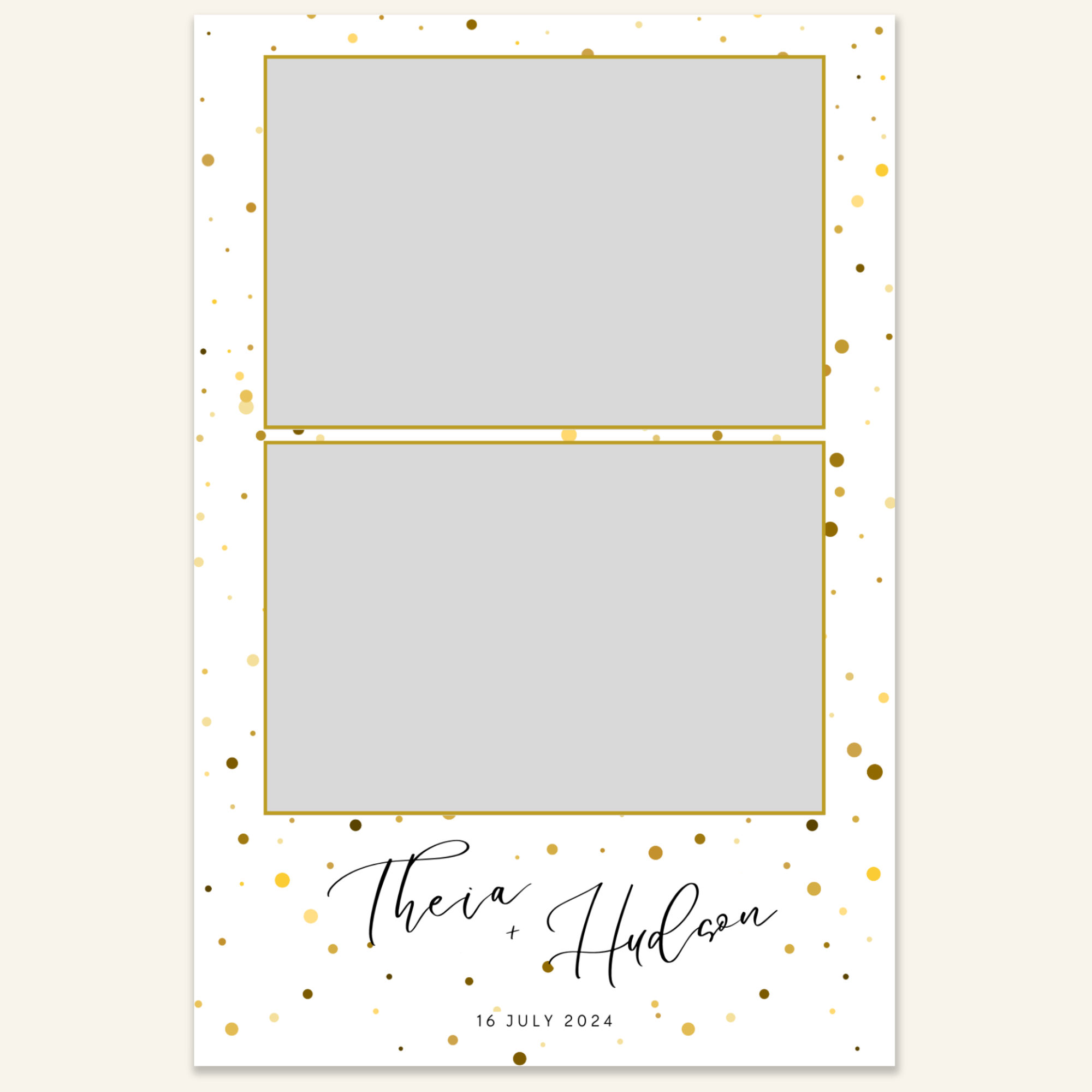 Step 3: Personalise your print template by adding your event name, date, and/or custom message. (eg. Sophia & Lucas / 12 April 2024 / Thanks for joining us!)