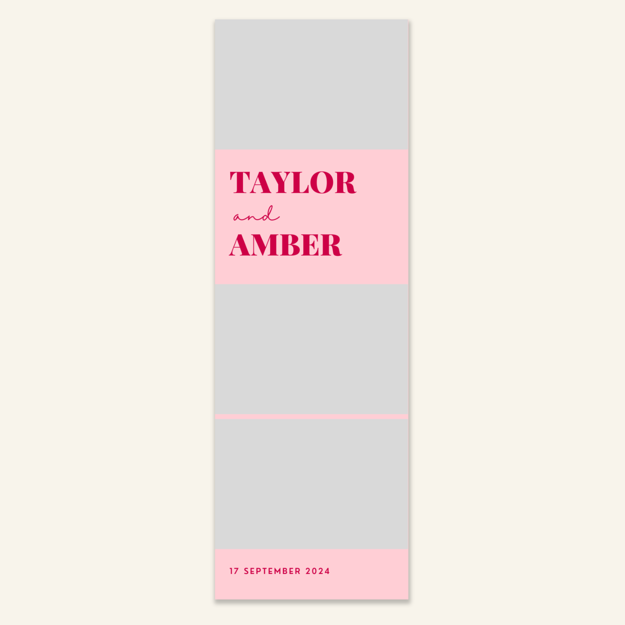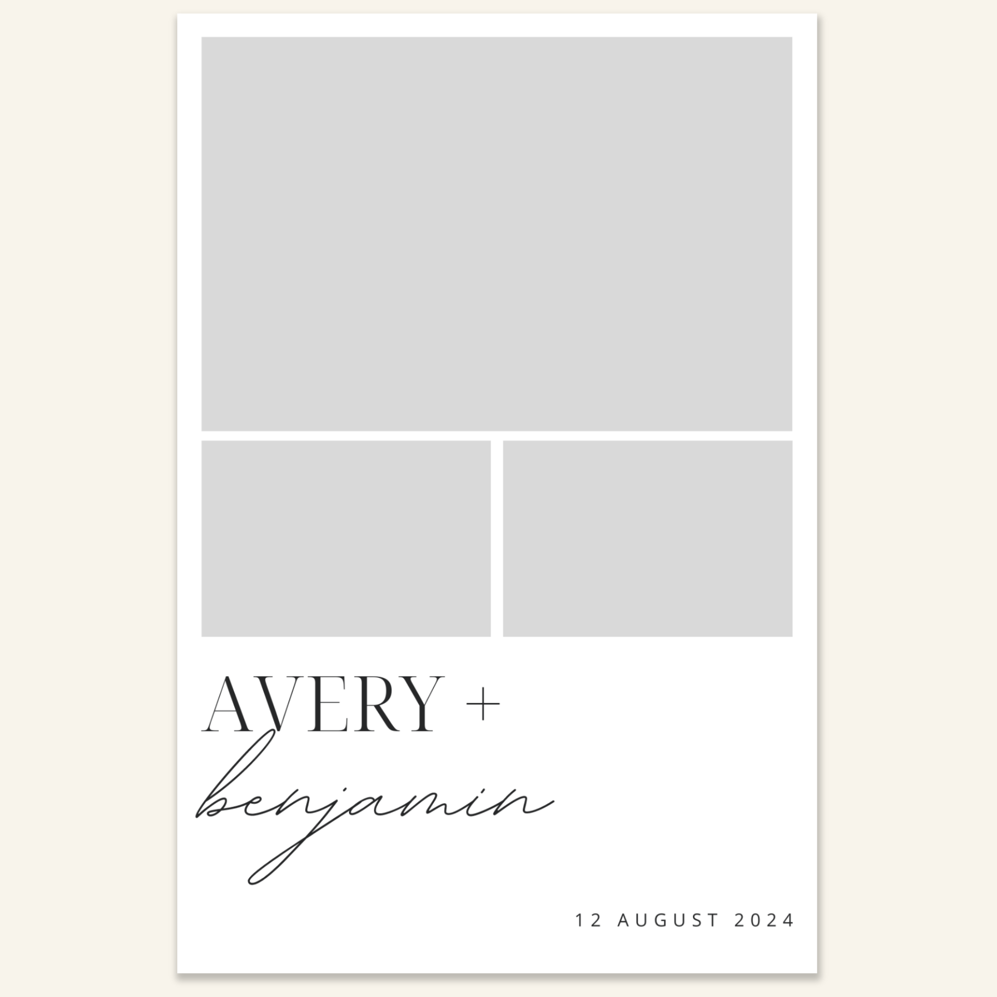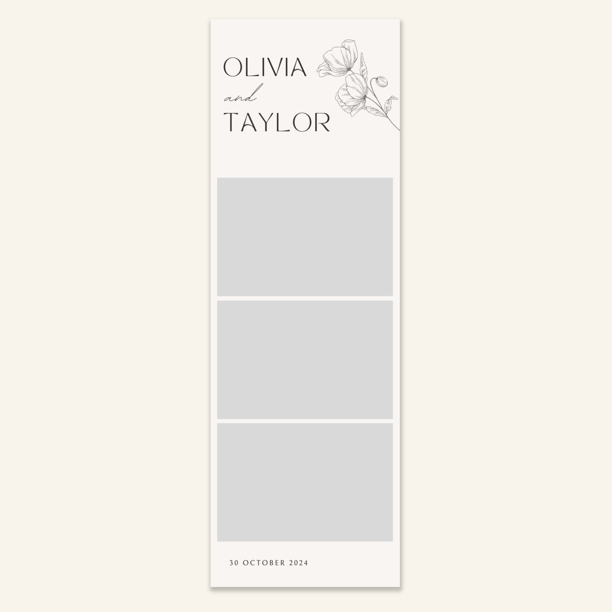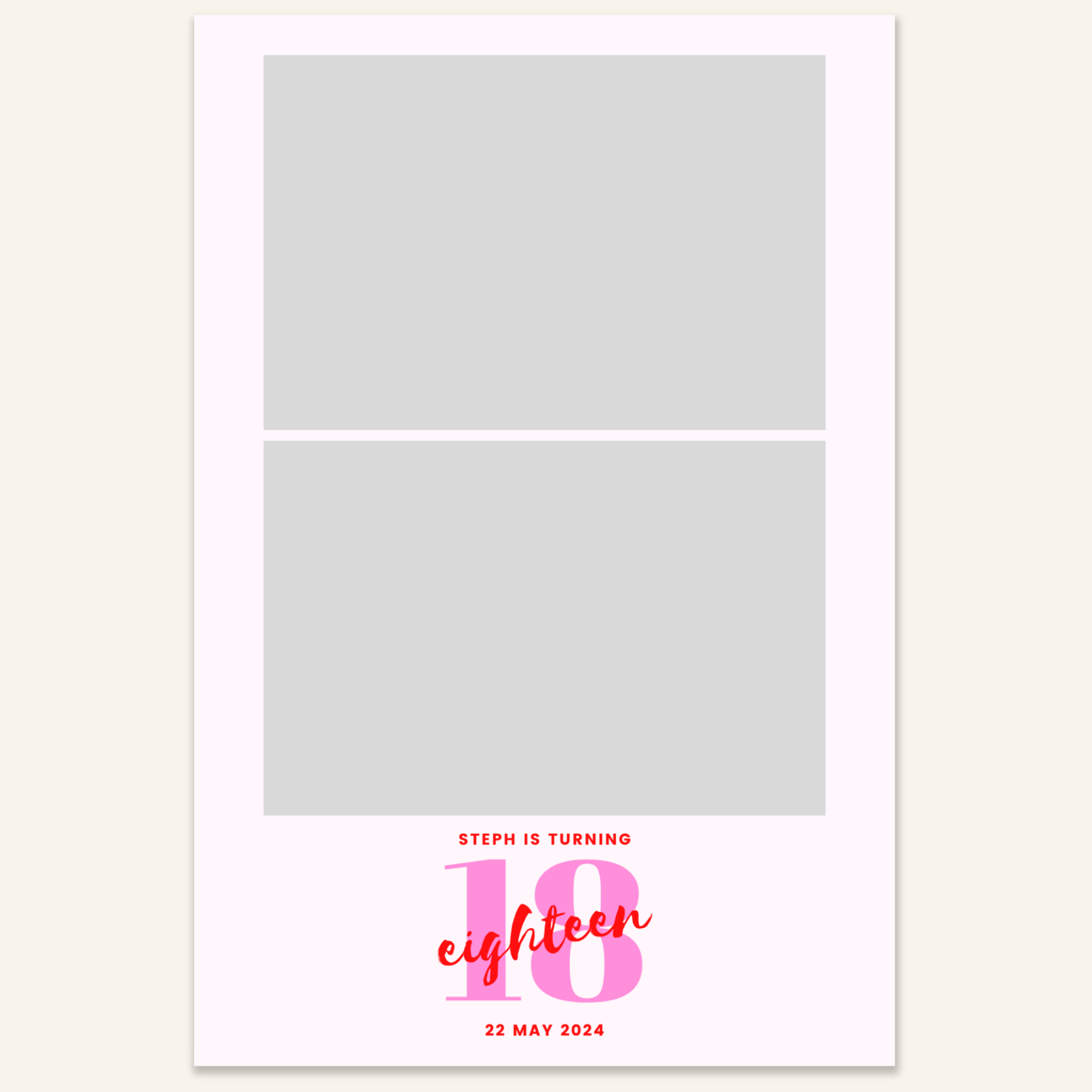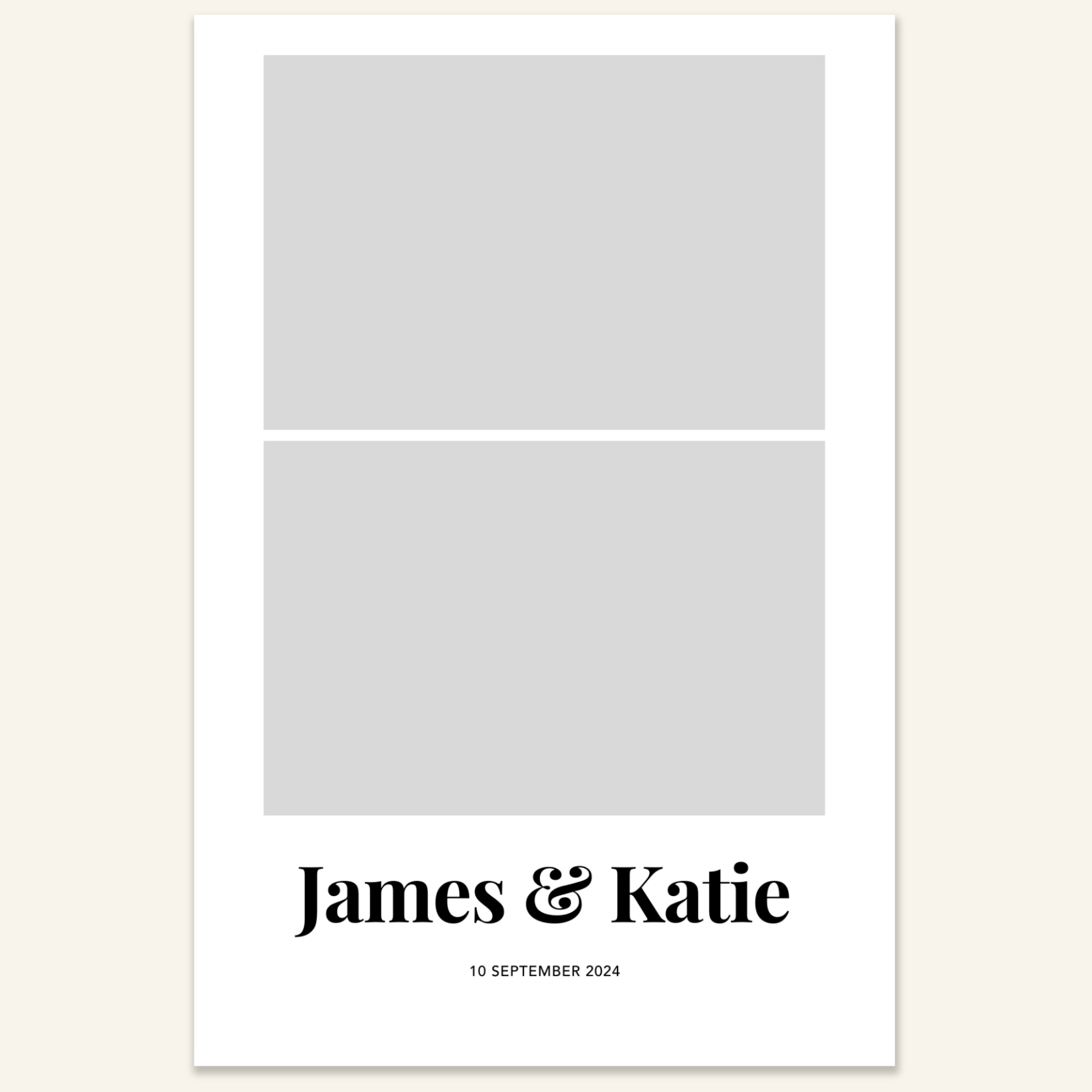 Step 3: Personalise your print template by adding your event name, date, and/or custom message. (eg. Sophia & Lucas / 12 April 2024 / Thanks for joining us!)