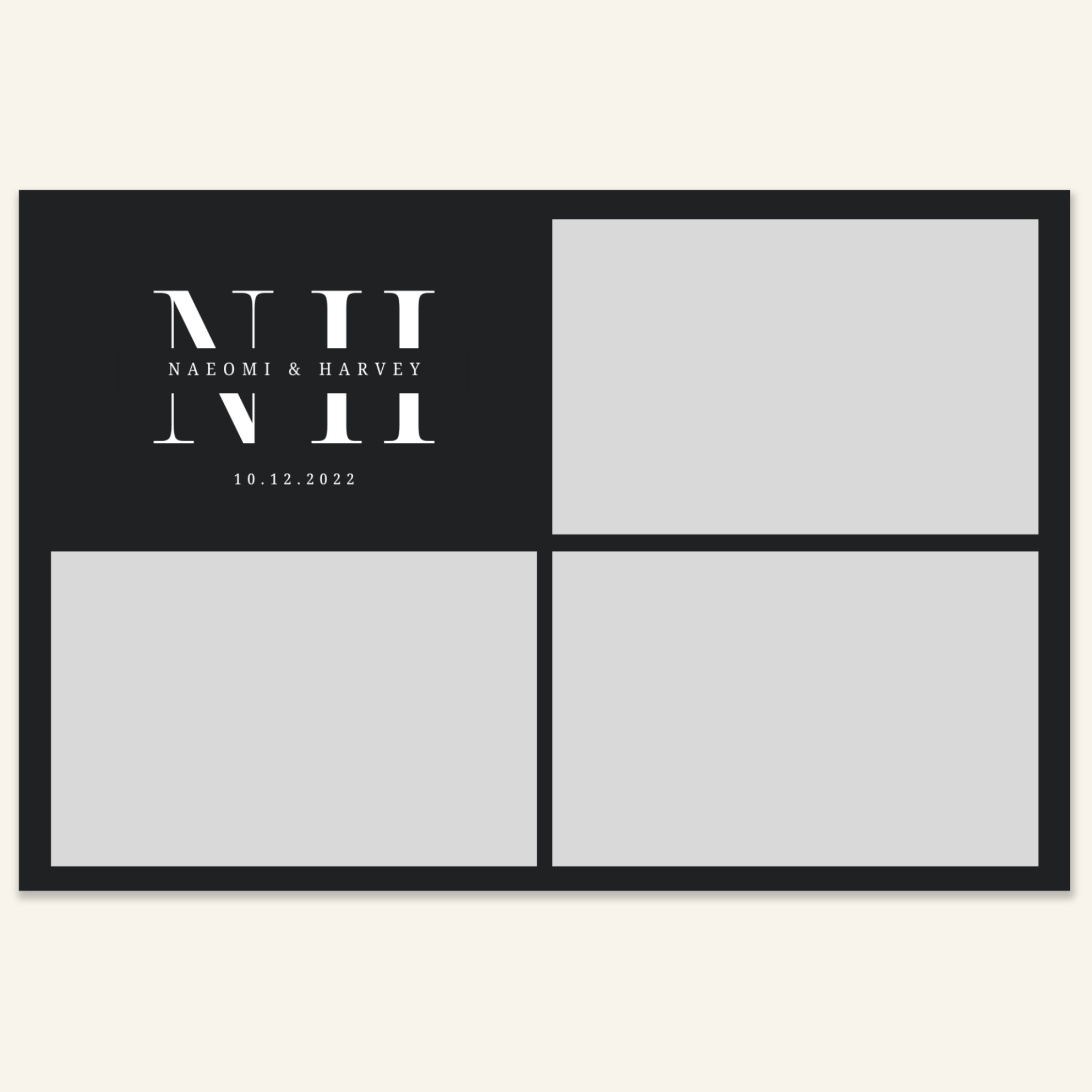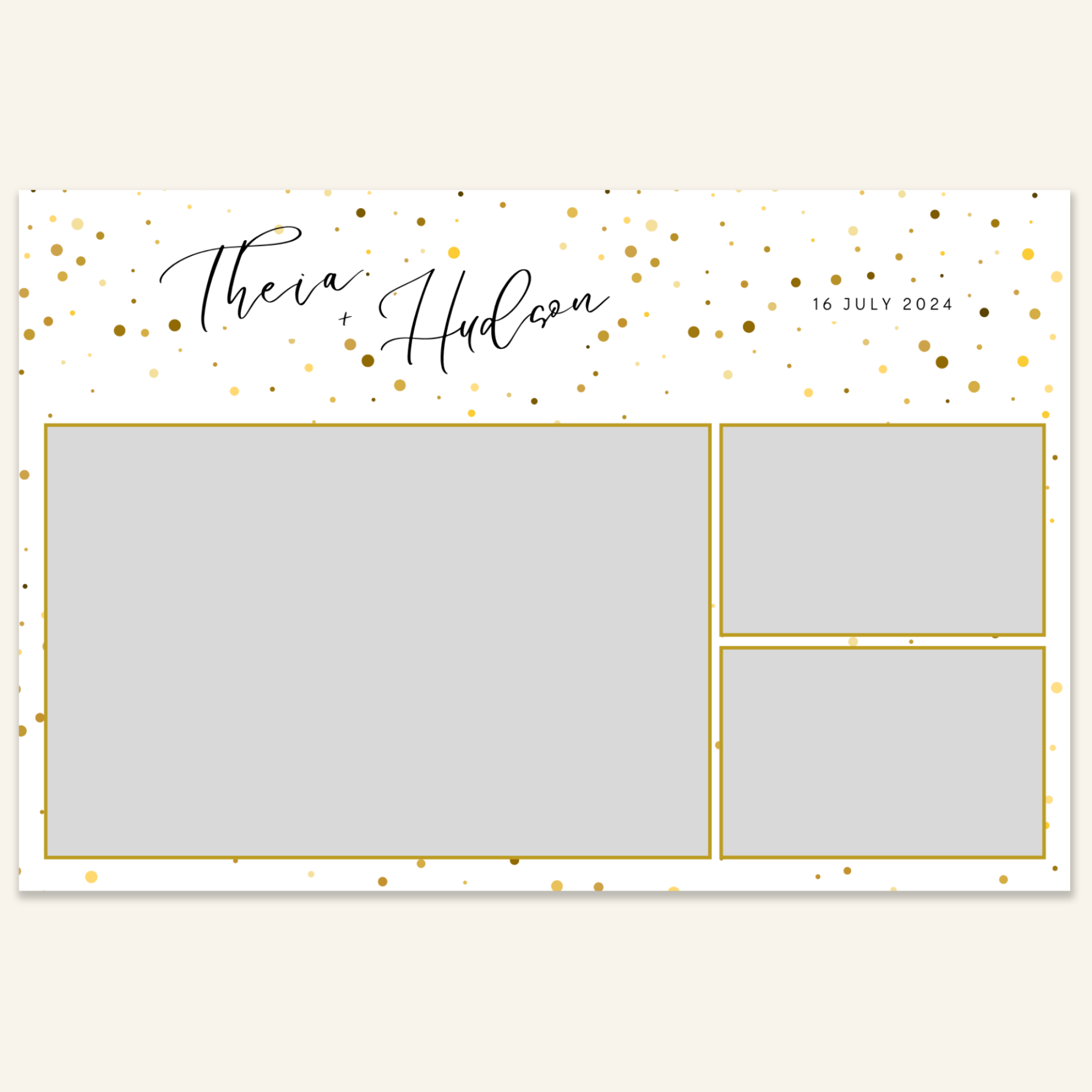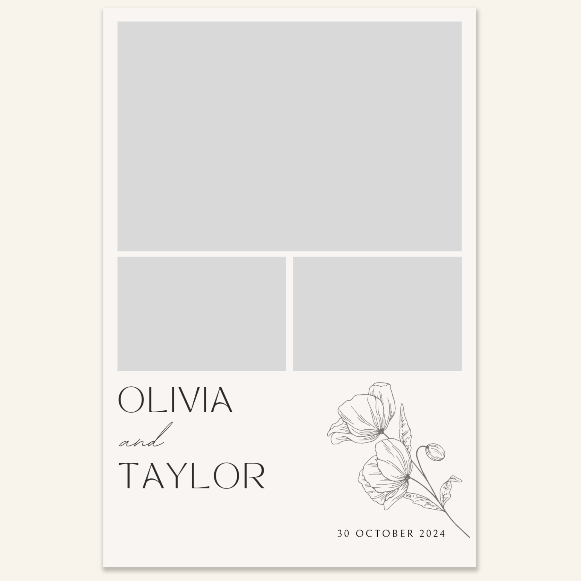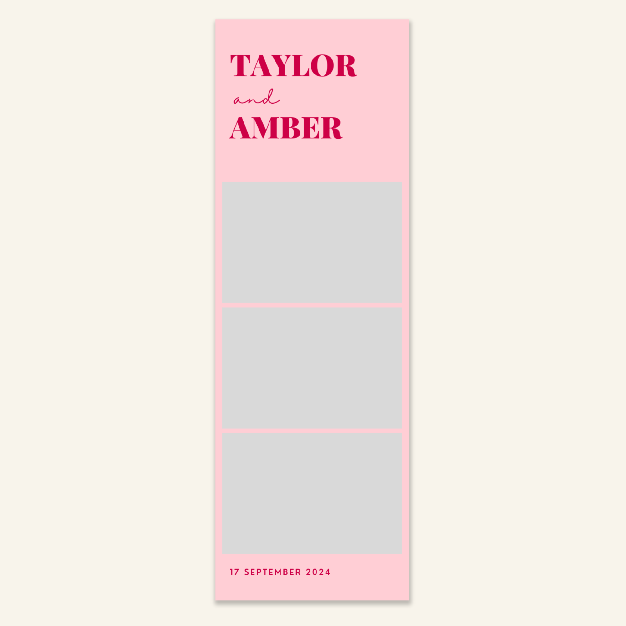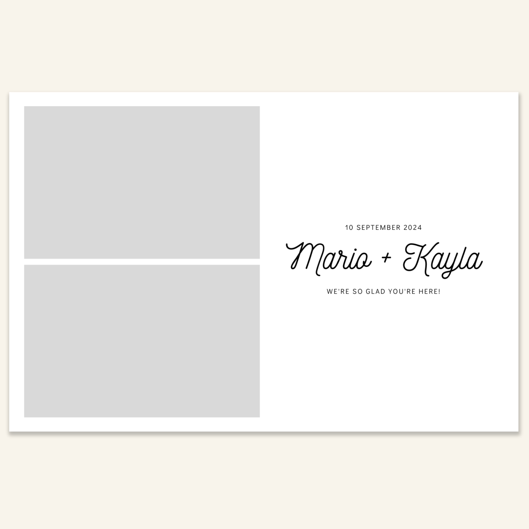 Step 3: Personalise your print template by adding your event name, date, and/or custom message. (eg. Sophia & Lucas / 12 April 2024 / Thanks for joining us!)