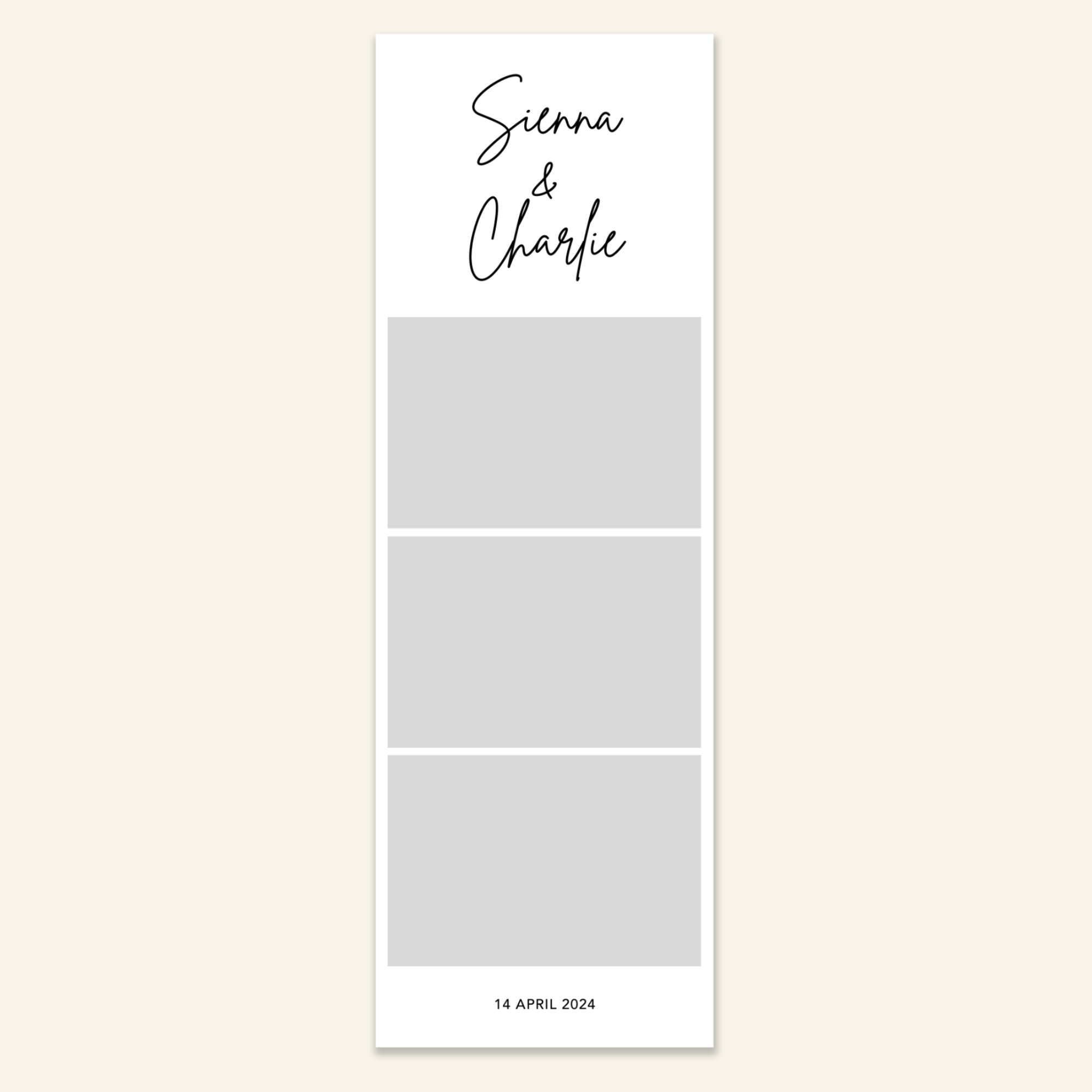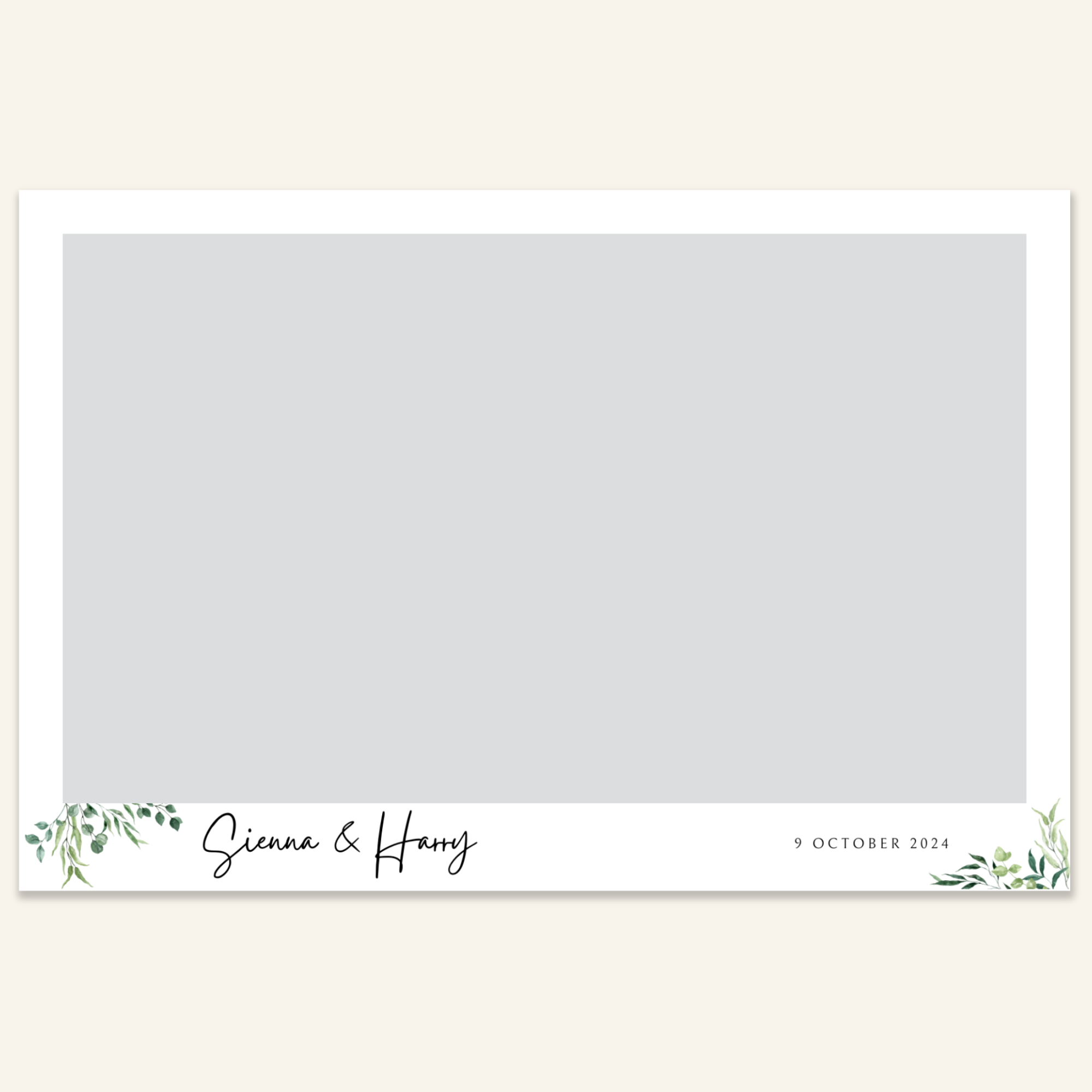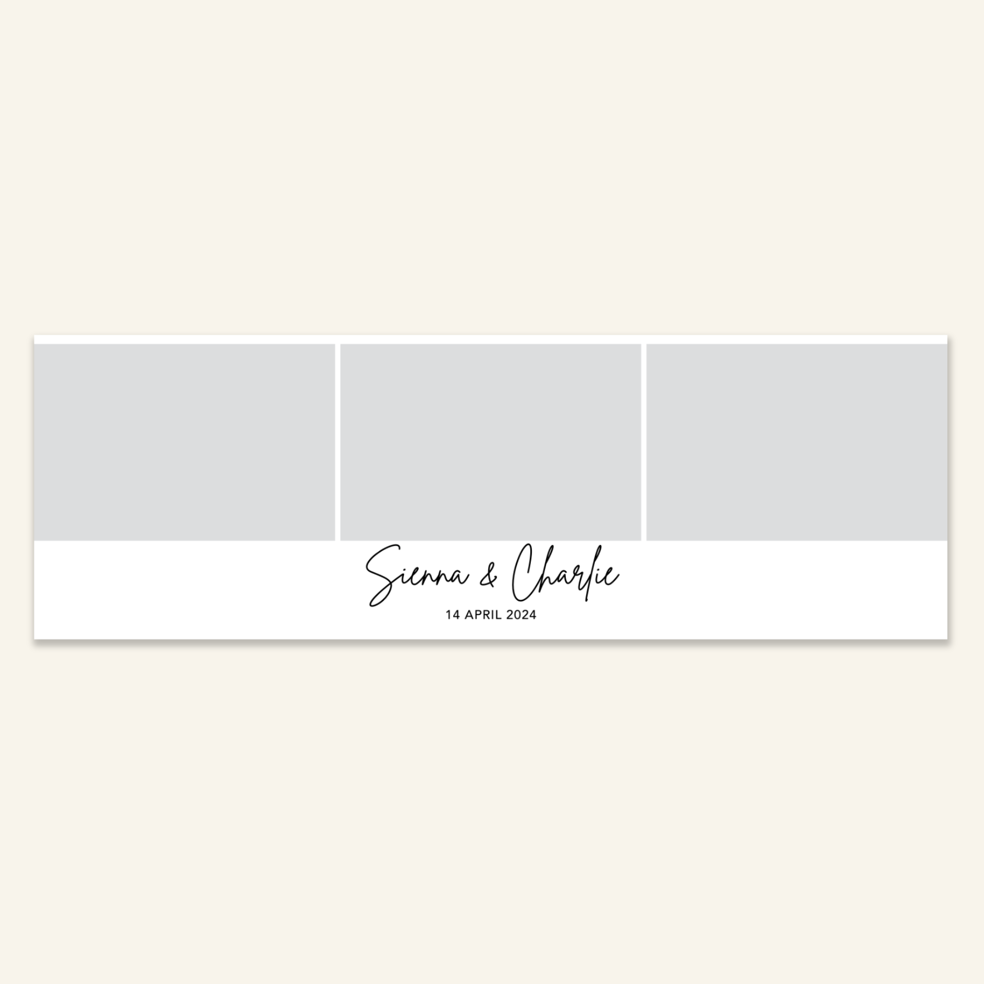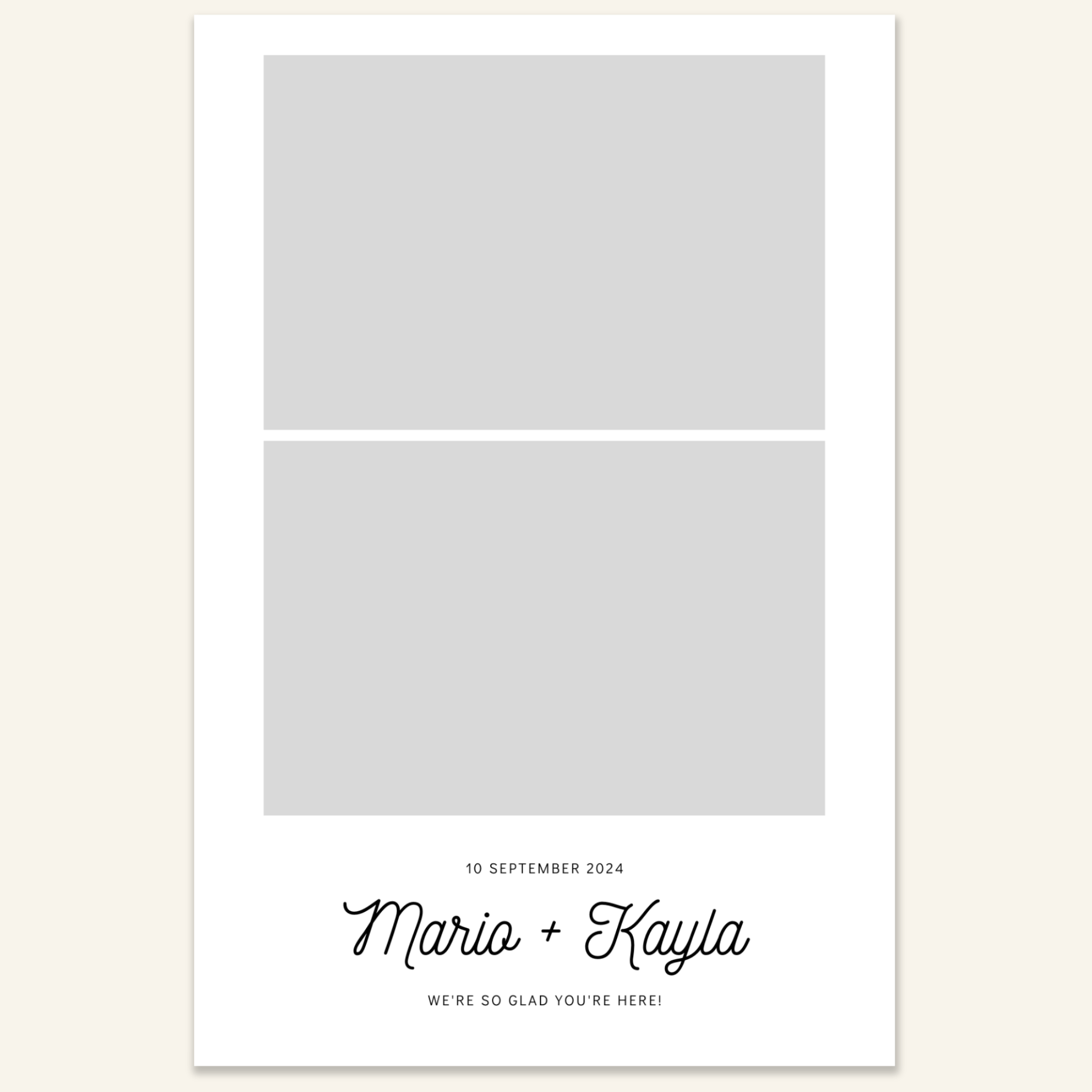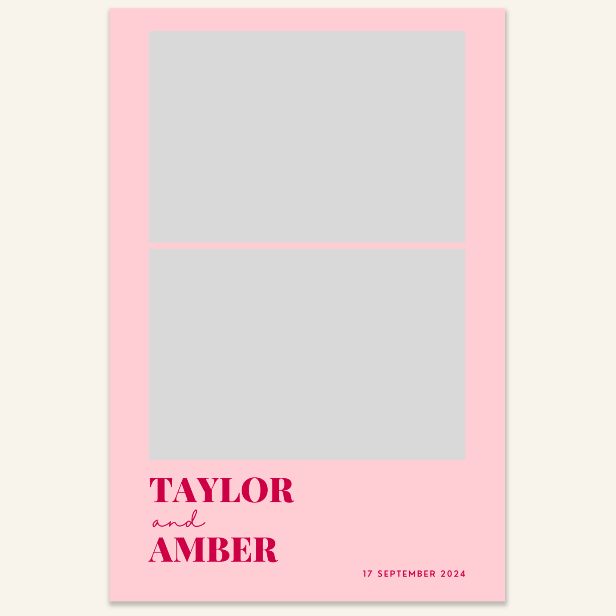 Step 3: Personalise your print template by adding your event name, date, and/or custom message. (eg. Sophia & Lucas / 12 April 2024 / Thanks for joining us!)
