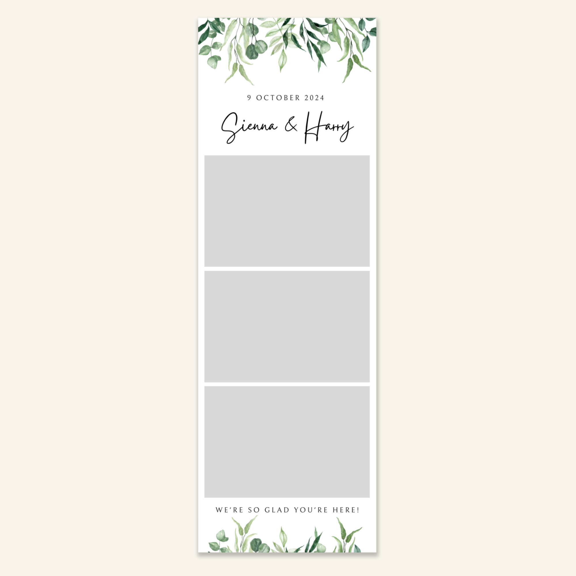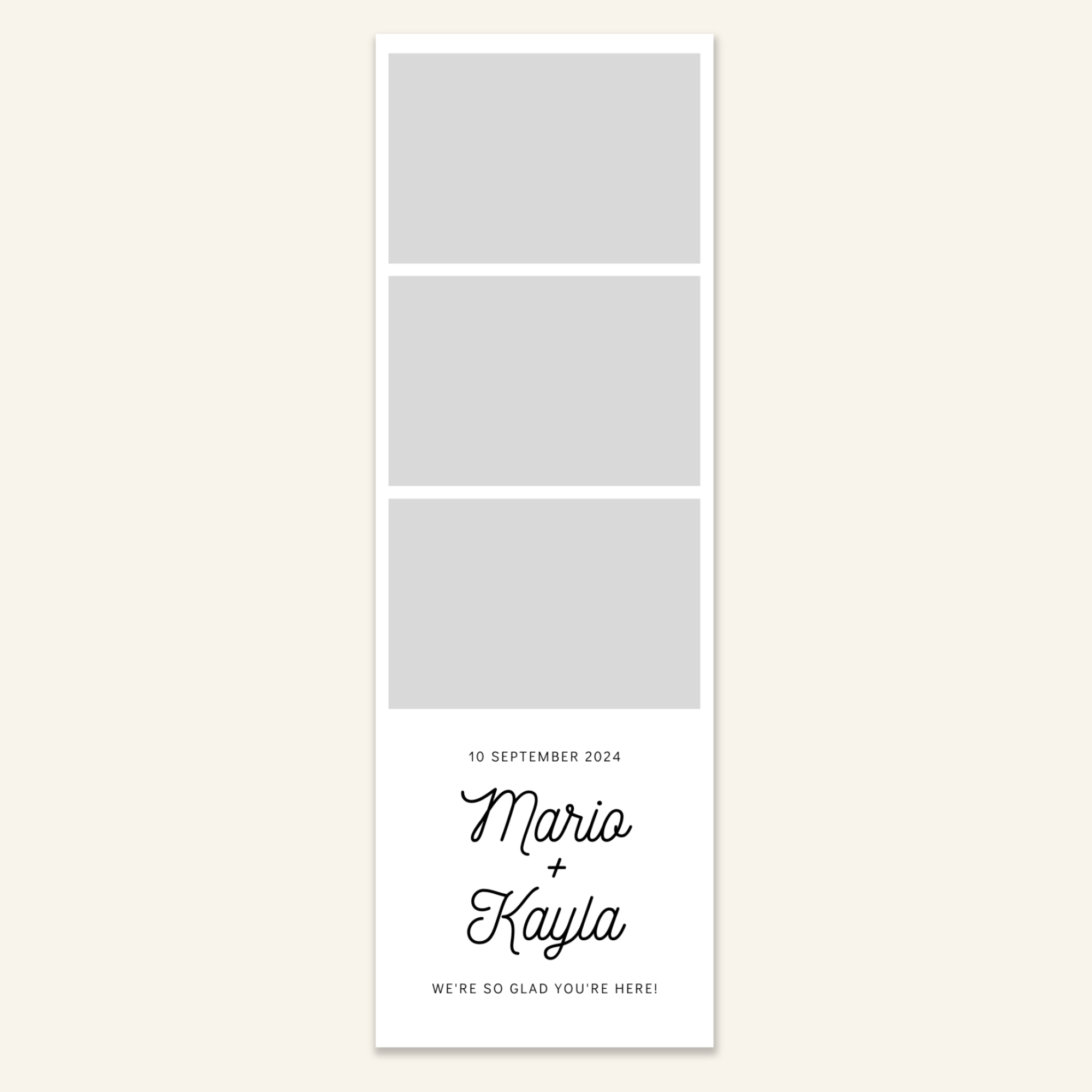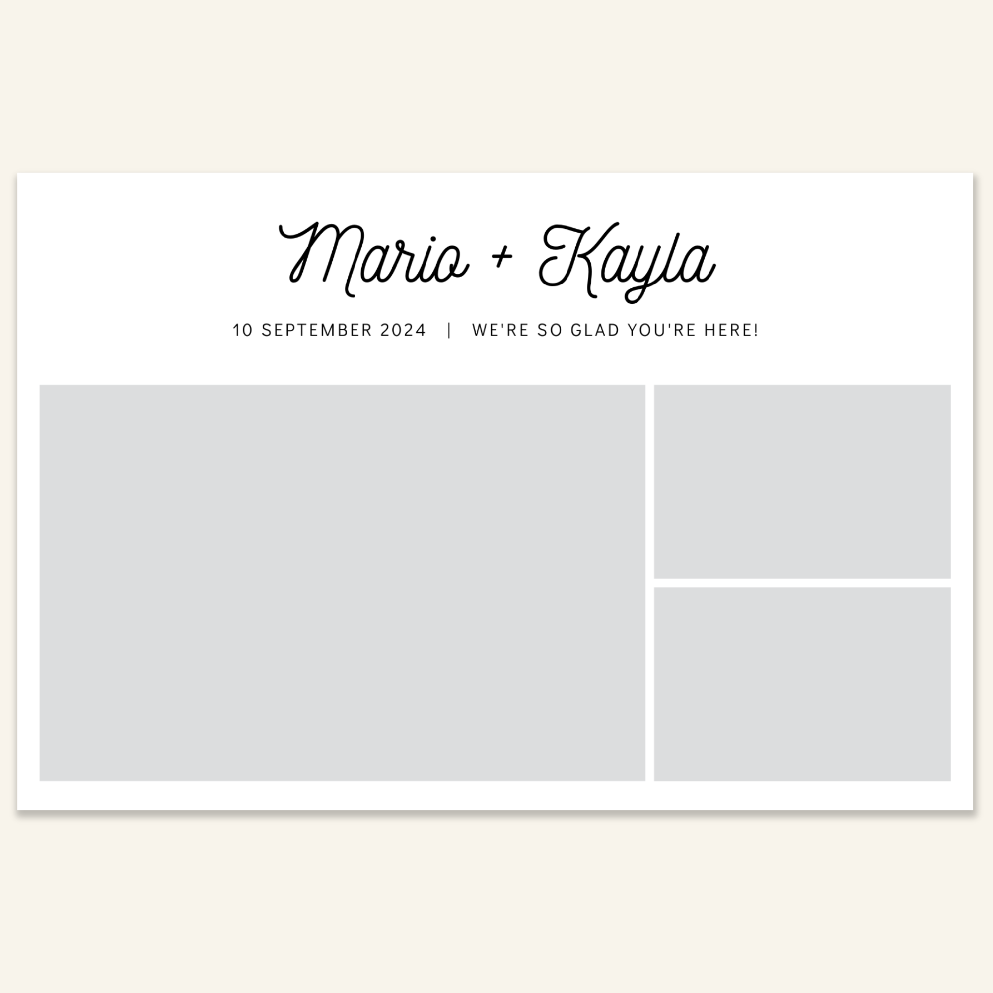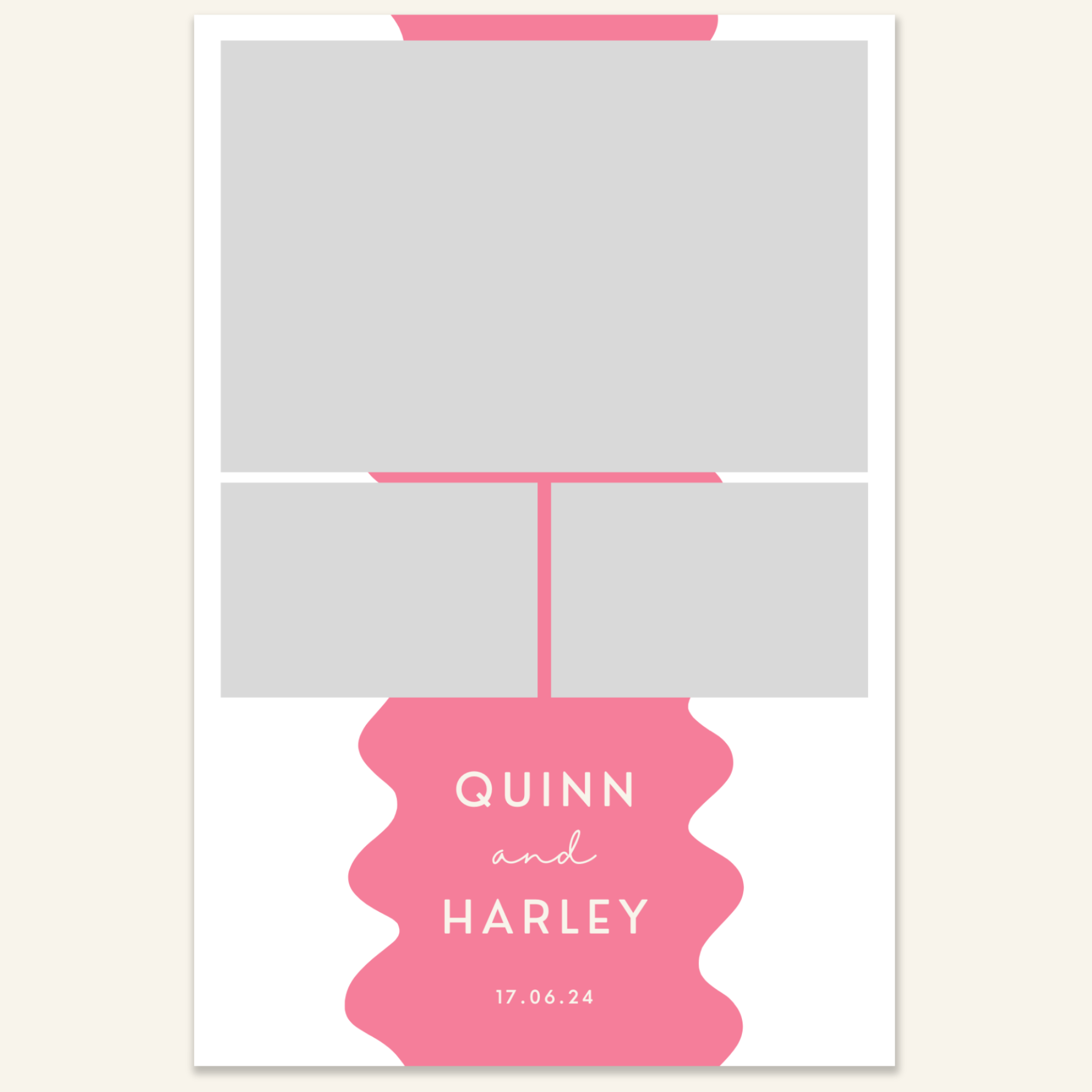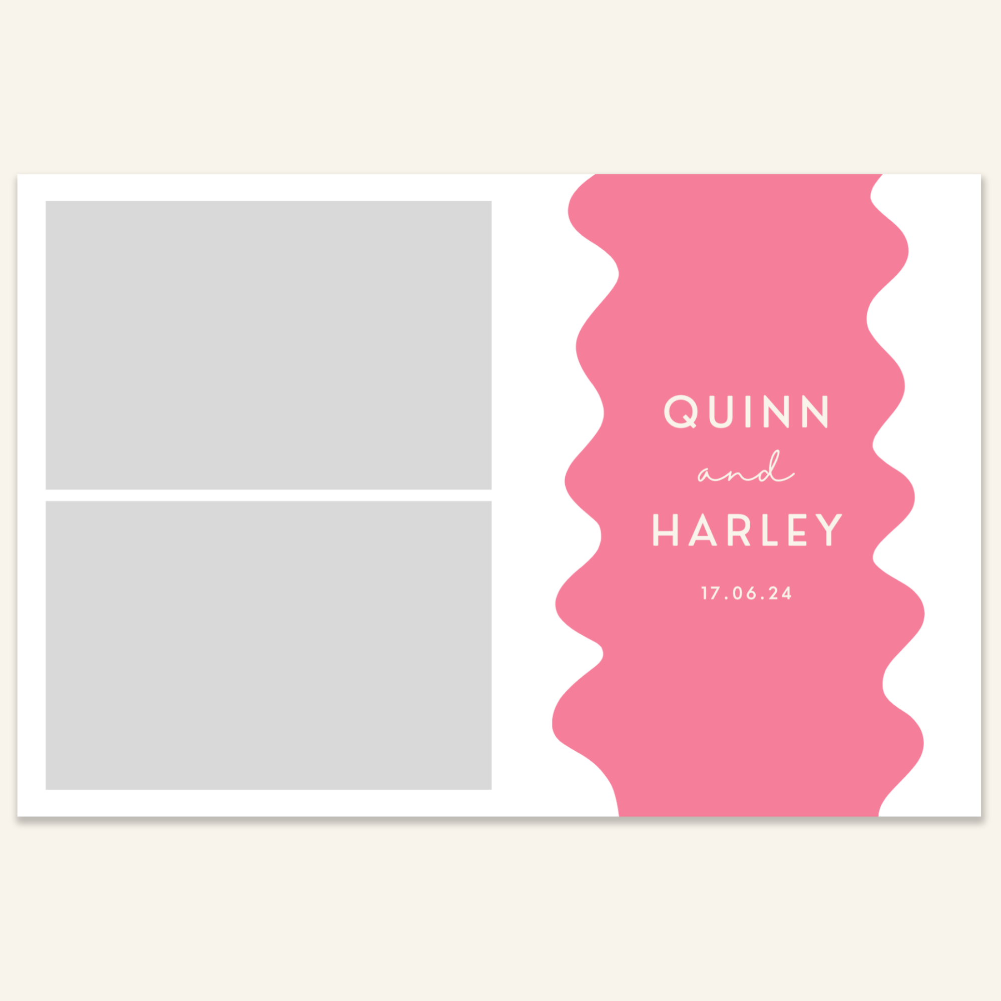 Step 3: Personalise your print template by adding your event name, date, and/or custom message. (eg. Sophia & Lucas / 12 April 2024 / Thanks for joining us!)
