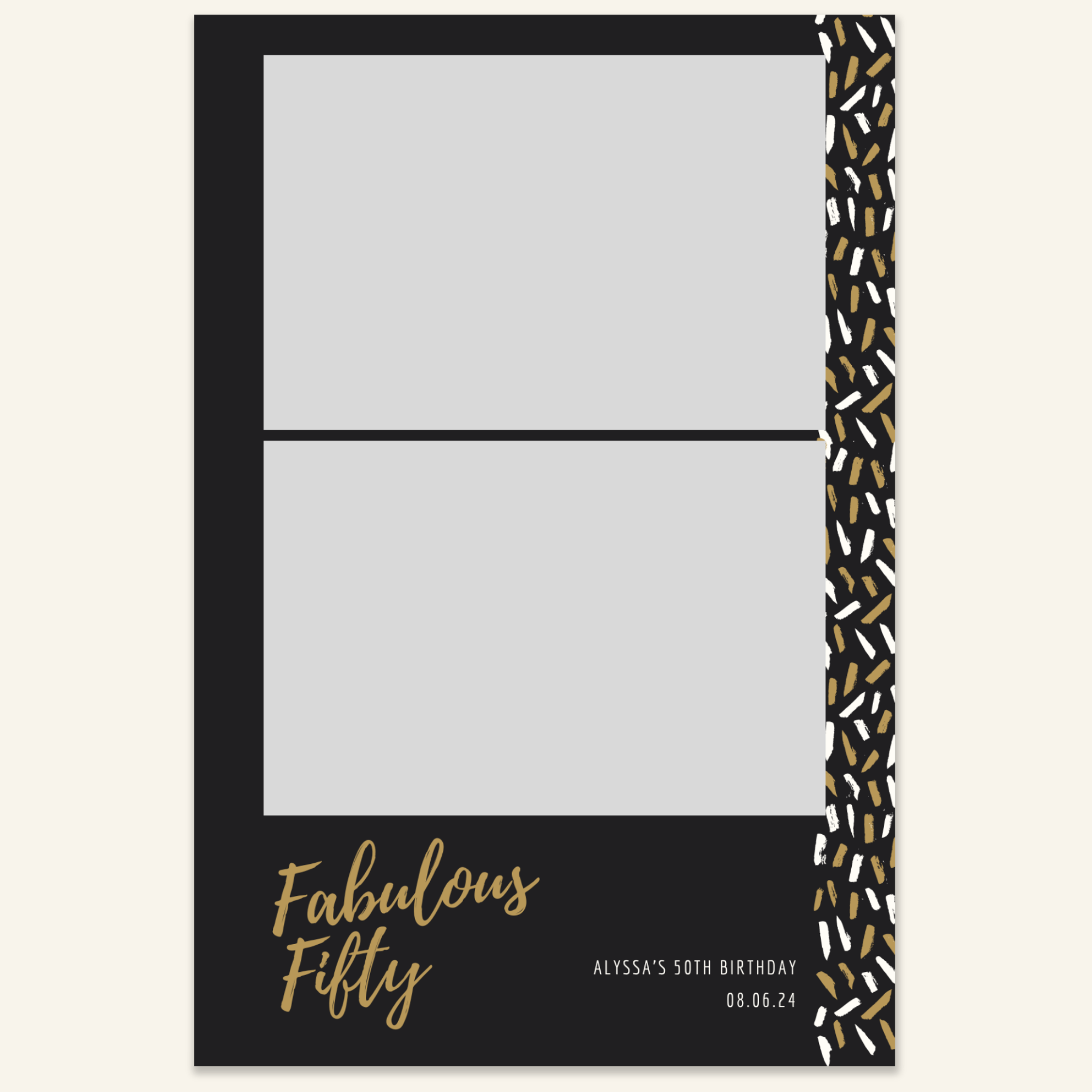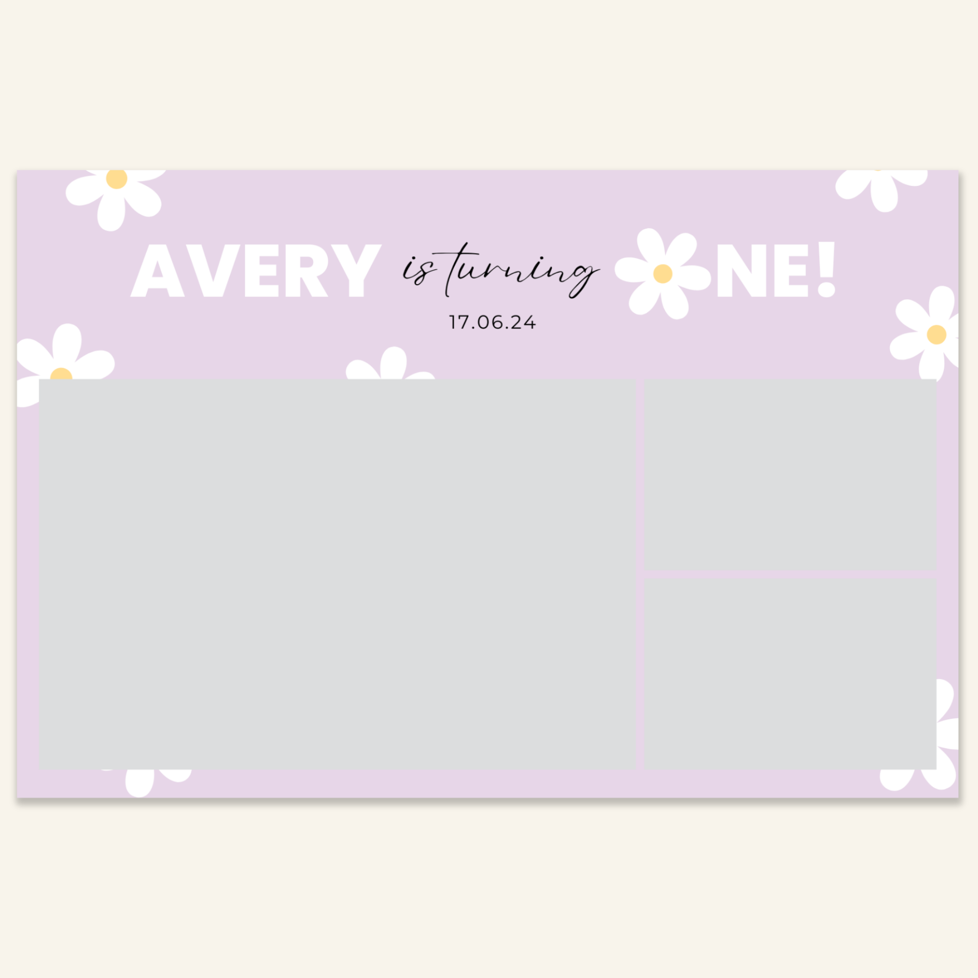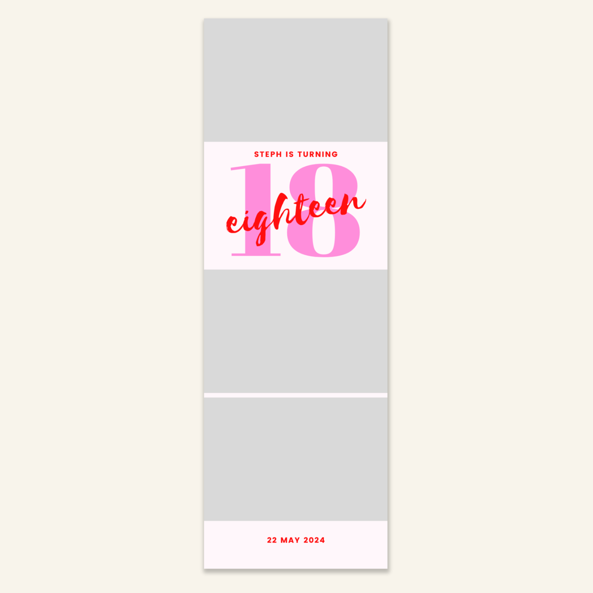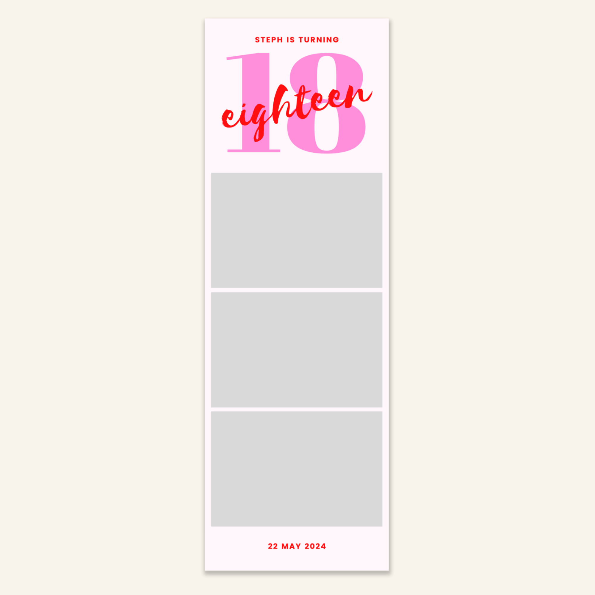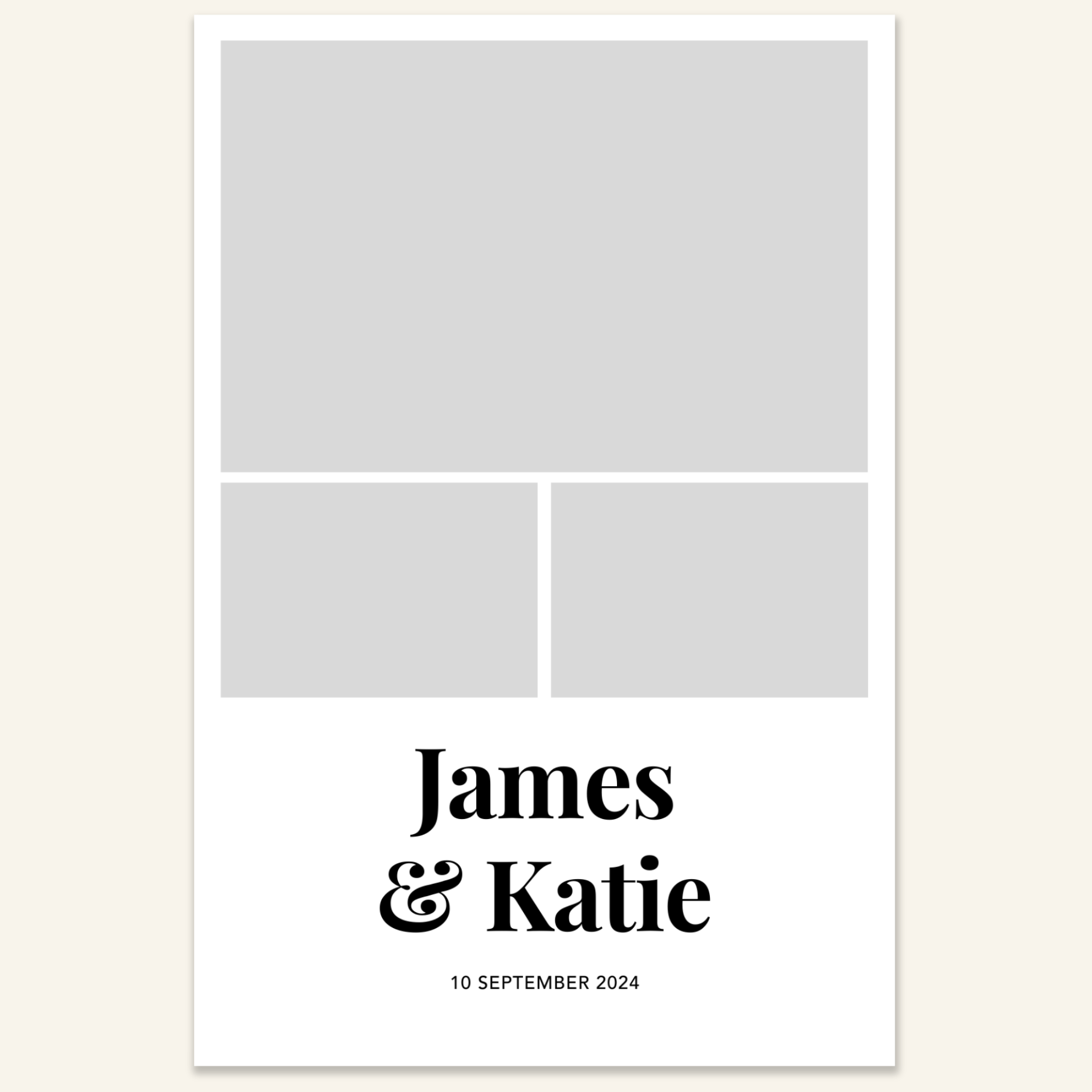 Step 3: Personalise your print template by adding your event name, date, and/or custom message. (eg. Sophia & Lucas / 12 April 2024 / Thanks for joining us!)