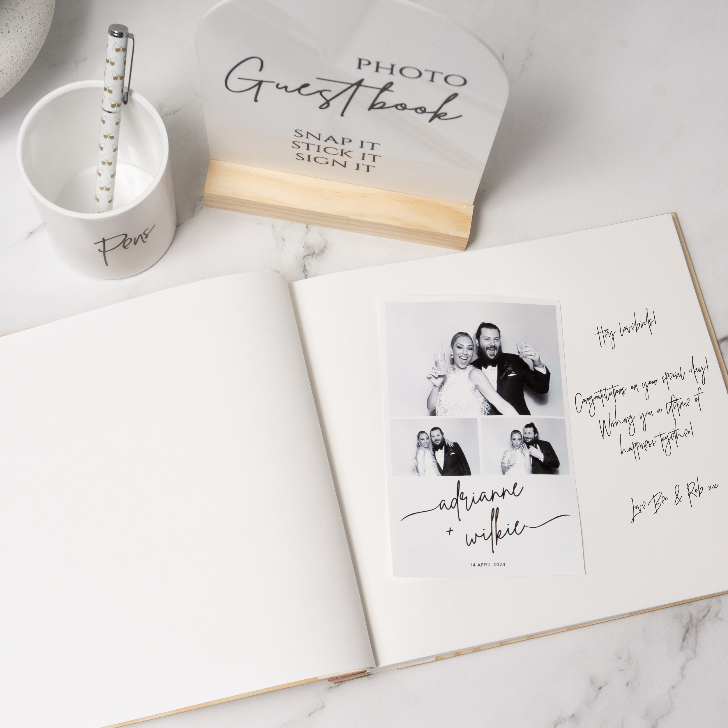 An interactive guest book created live on the night. Guests add their printed photo strip, leave a message and build a keepsake you’ll revisit for years.